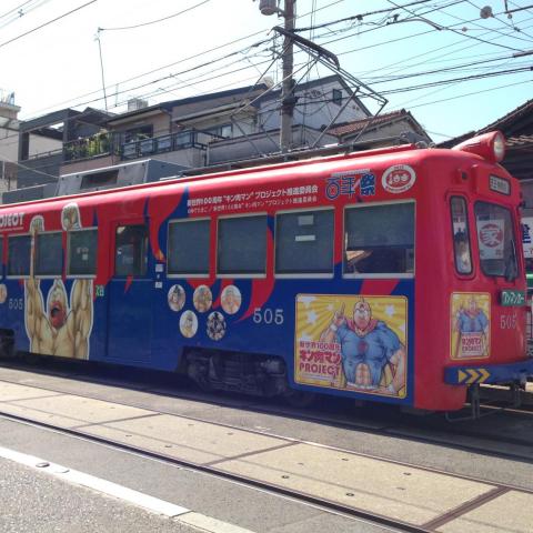 妙国寺を出て大阪市内へ戻ります。妙国寺前から乗ったのはキン肉マン電車の505号、阪堺電車の方も同行し…