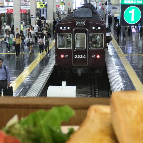 Cafe LILASでトーストを前景に3300系。1号線は北千里行と…