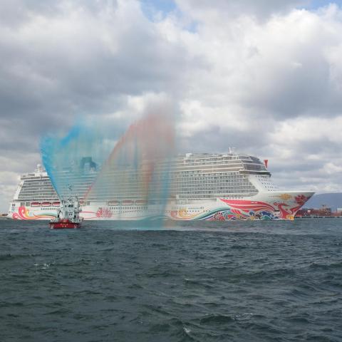 天保山に17万トンクラスという超巨大クルーズ船入港、歓迎放水の消防艇が間近で見られるはずのシーサイドコスモへ。