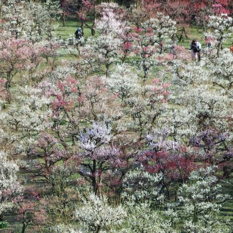 本丸から満開の梅林を俯瞰。真ん中のやたらと白い梅は何だろう、また行って調べて来ないと。…