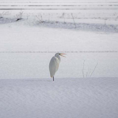 水曜木曜とこの冬一番の寒気、彦根で30cmの積雪。薄く雪の残った田んぼで二番穂を採餌しているコハクチョウは見たことがある…