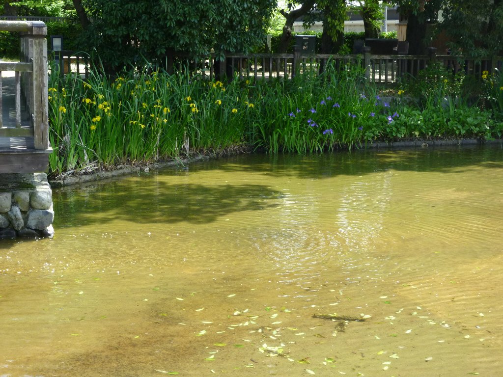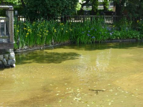 環濠集落で、お堀が復元されており、菖蒲も咲いています。
