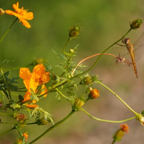 キバナコスモスにウスバキトンボ