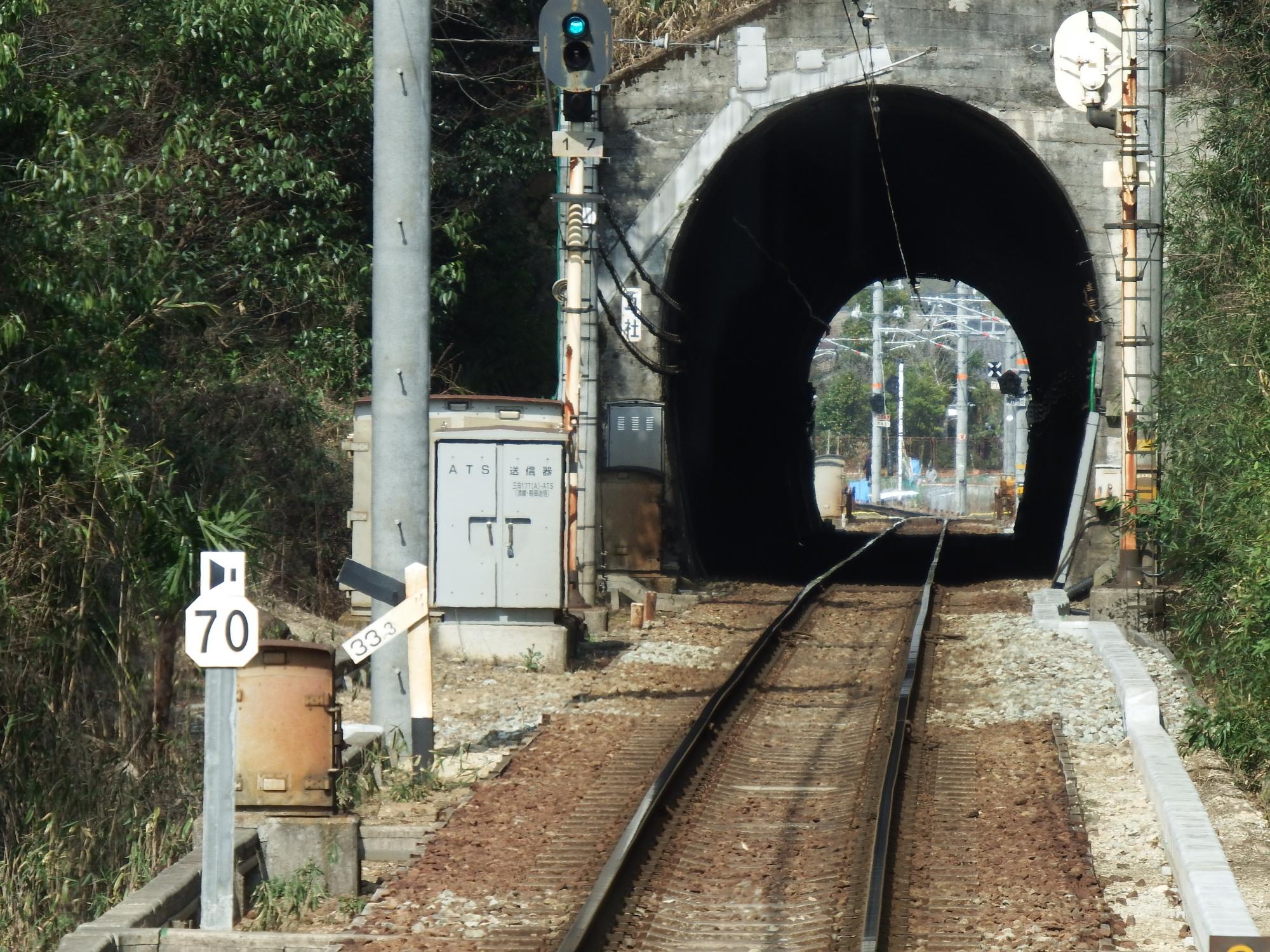 五社駅の短い単線トンネルを抜けます。やはりトンネル手前がピークになっていて下り勾配の標識が立っています。