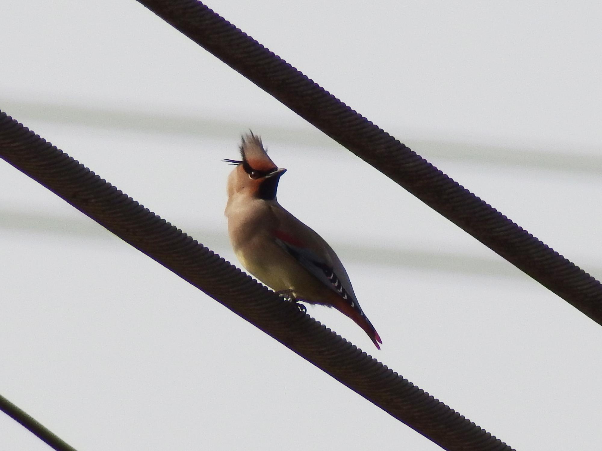 次の電車がやってきたので、鉄橋に向かうと、何と架線(正確には架線に並行した電線)にヒレンジャク!電車が通過するまでのわずかな一瞬でした。