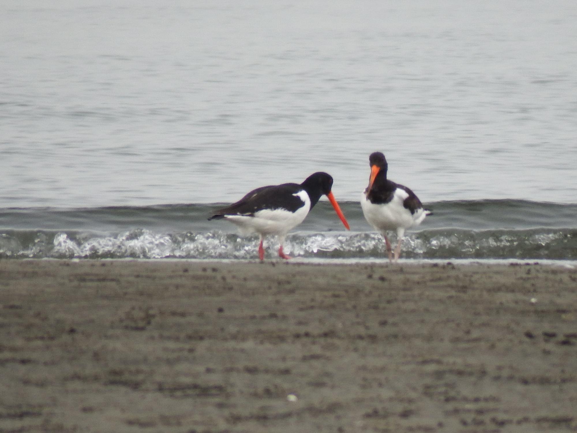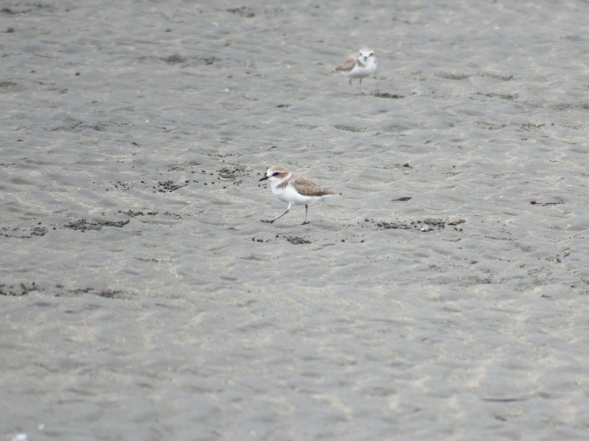 ふと気づくと、自分の立っている場所は水に囲まれて孤立していました。慌てて、水の浅いところを渡り浜の方に移動します。かわいいシロチドリが2羽。