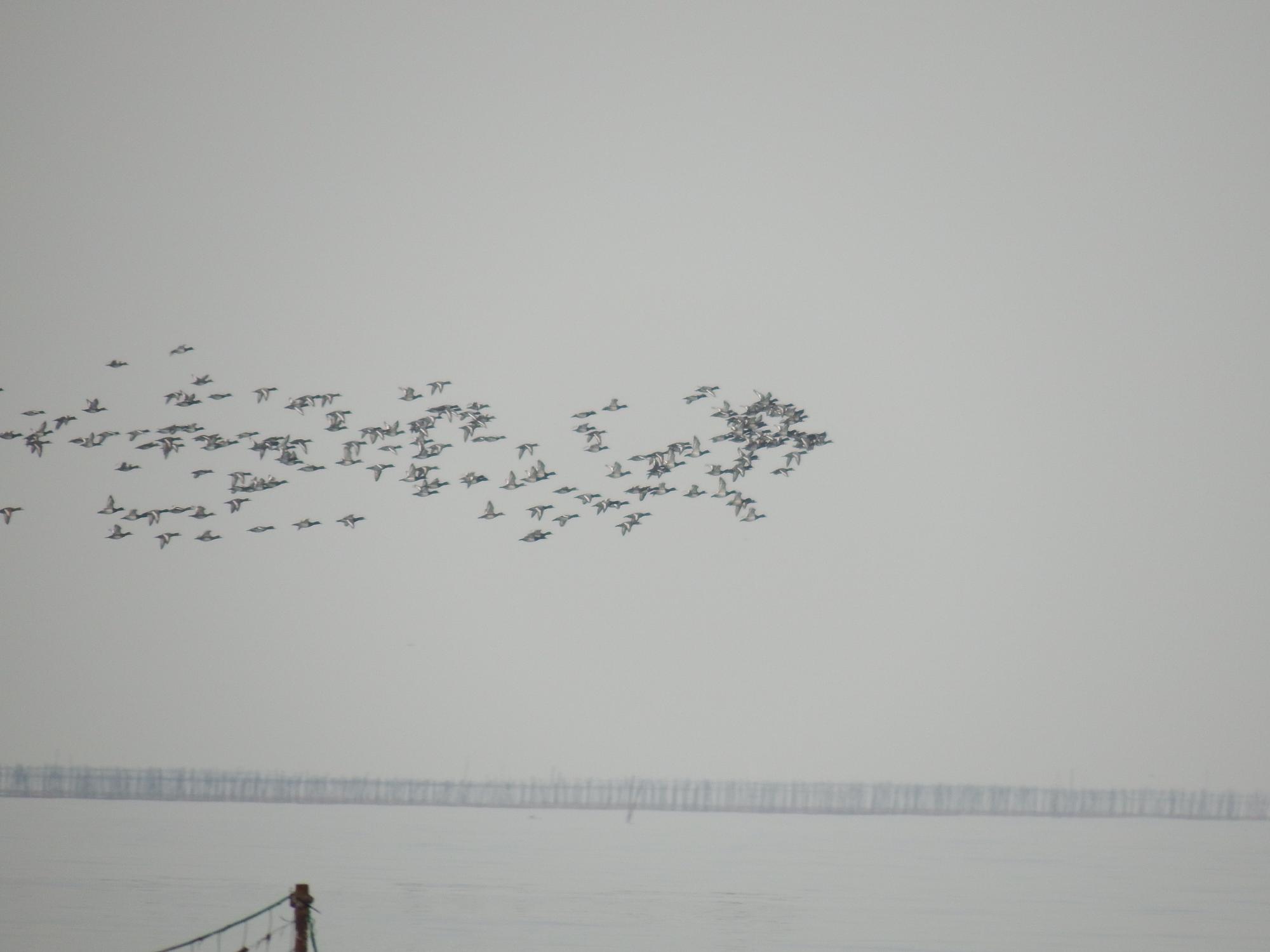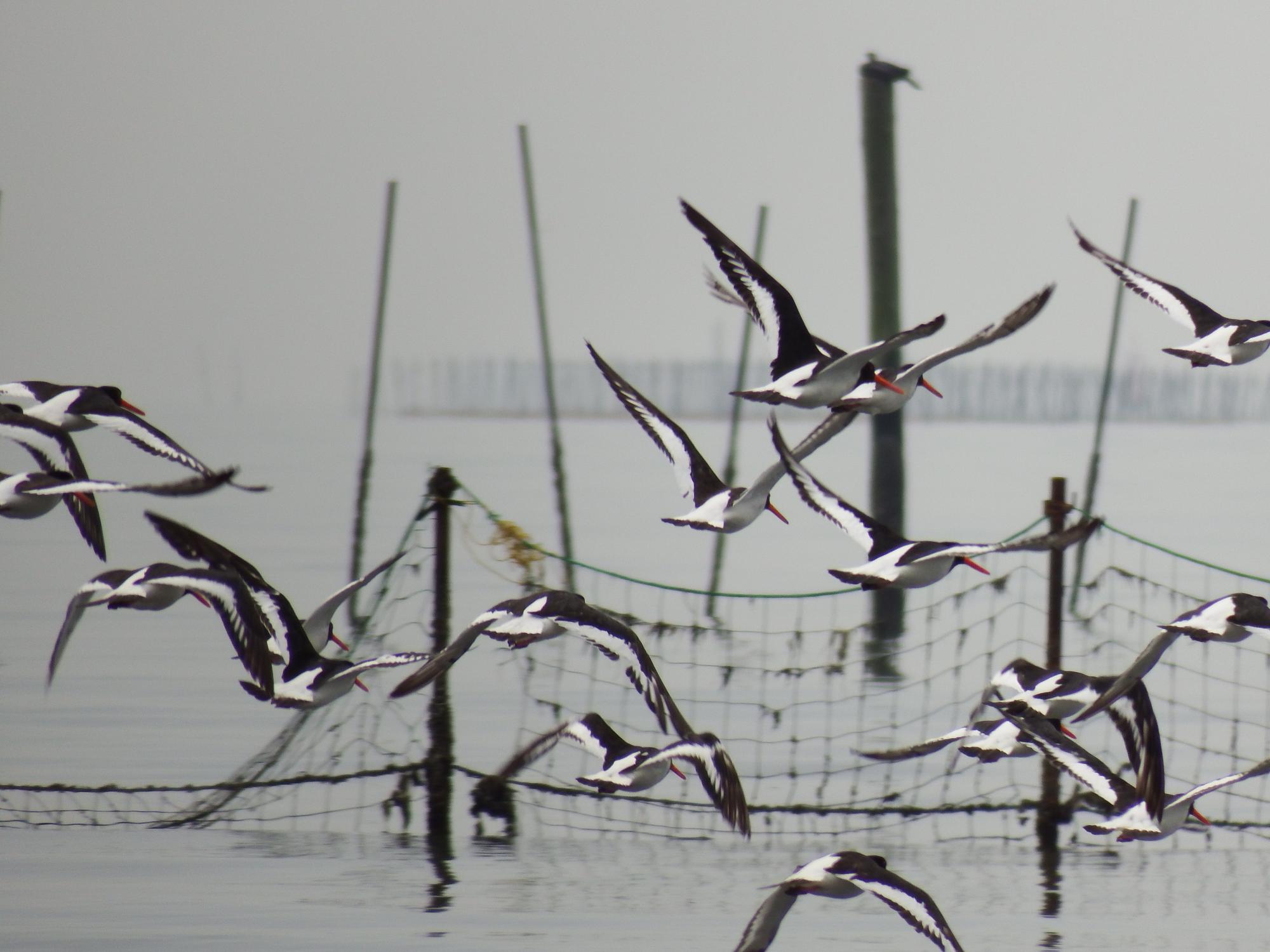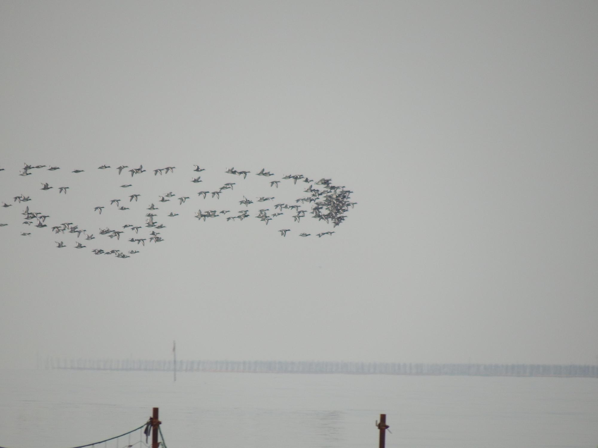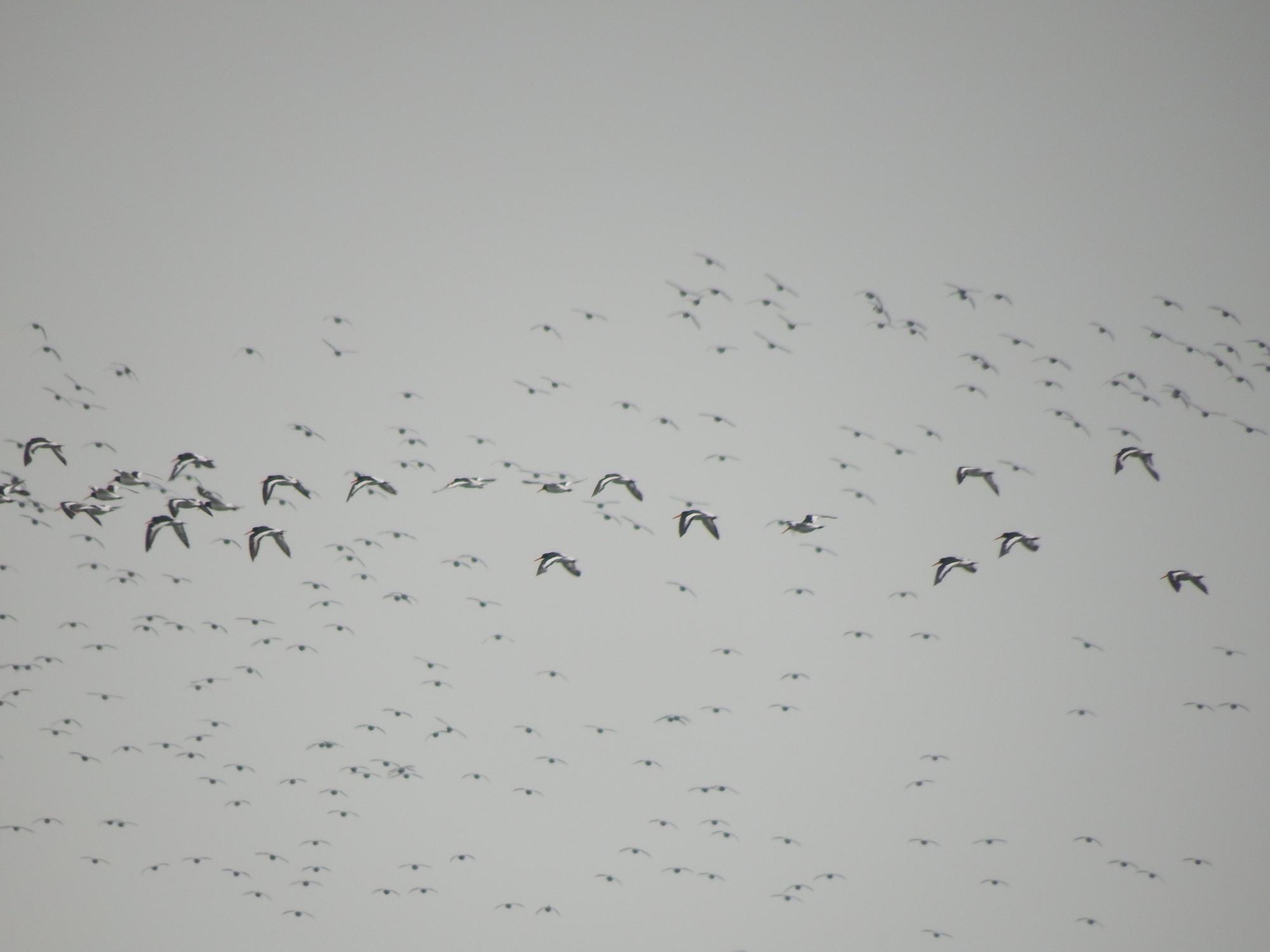 すると、上空に何やら鳥の大軍団が飛んできました。その大軍団もミヤコドリかどうかは遠くてよくわからないのですが、干潟のミヤコドリ軍団も上空の大軍団につられるように、一斉に飛び立ちました。