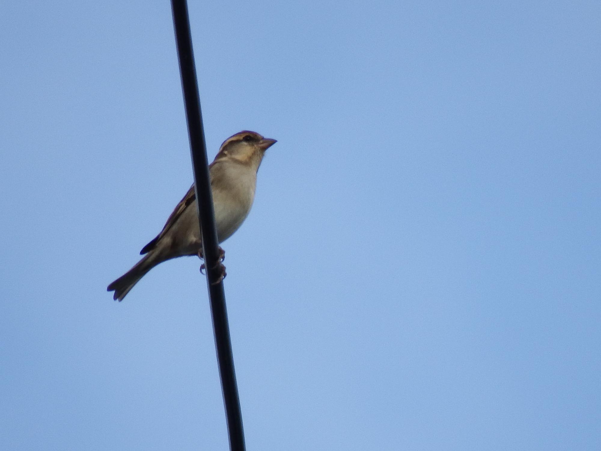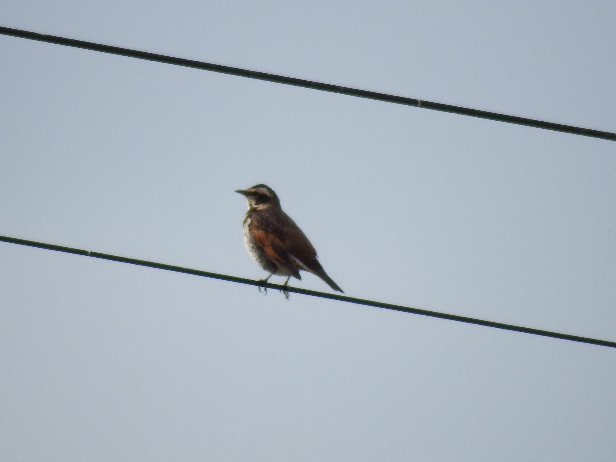 電線のツグミ、その隣にいたツグミより一回り小さい鳥、調べても調べても何の鳥か不明です。