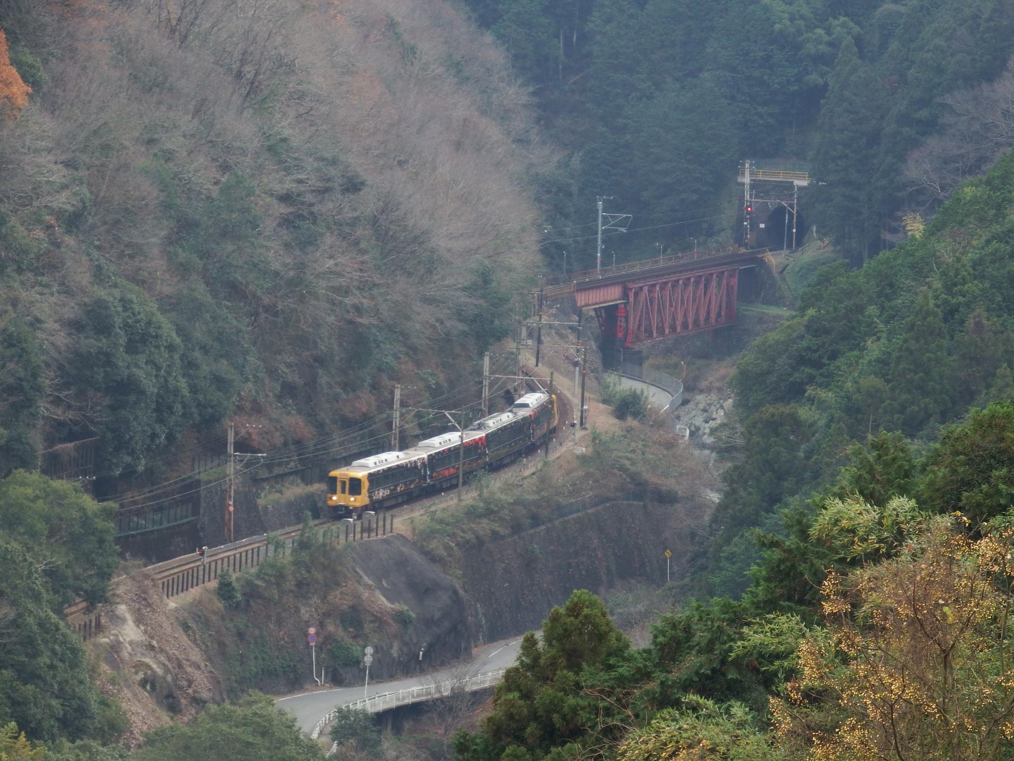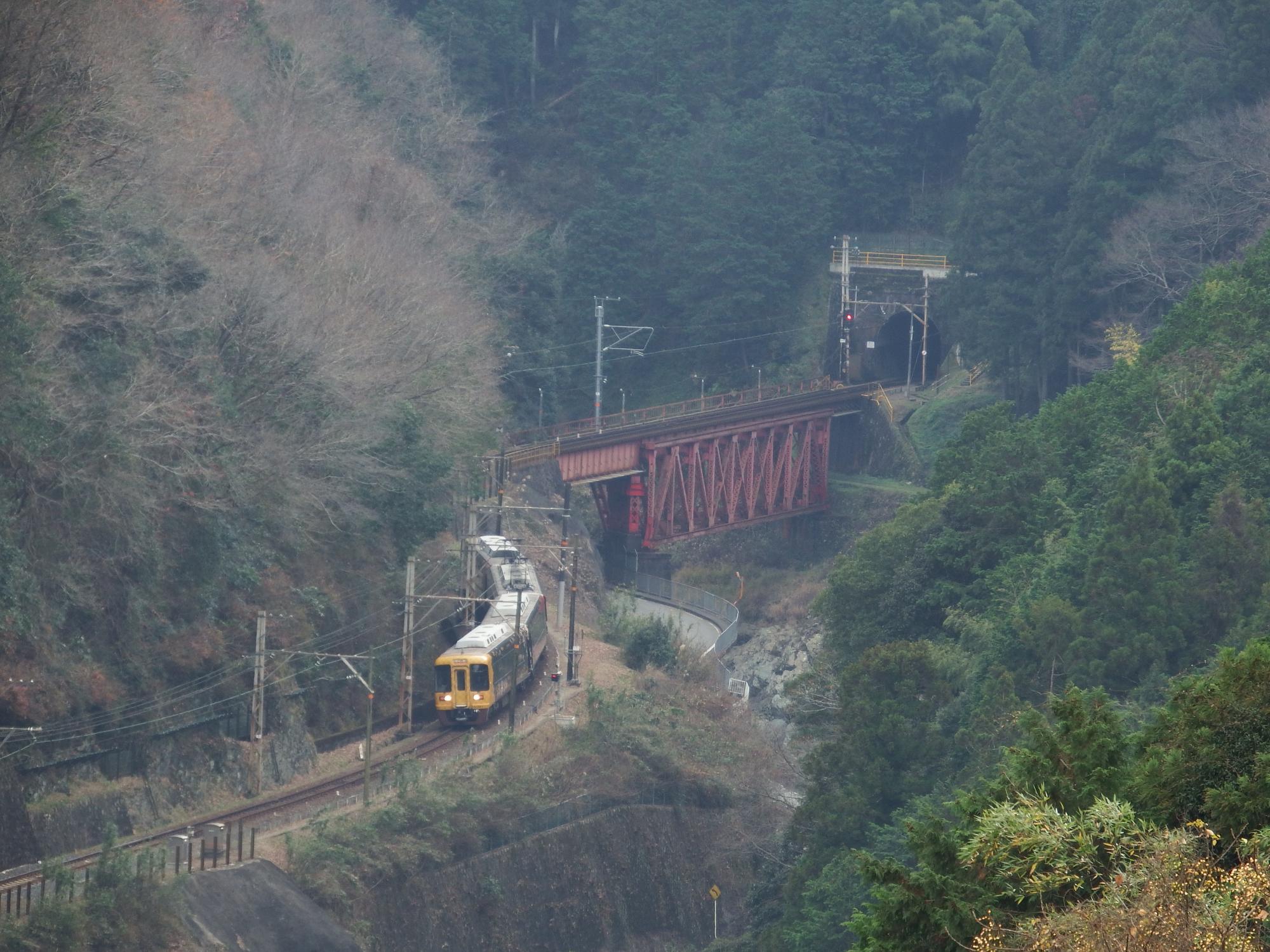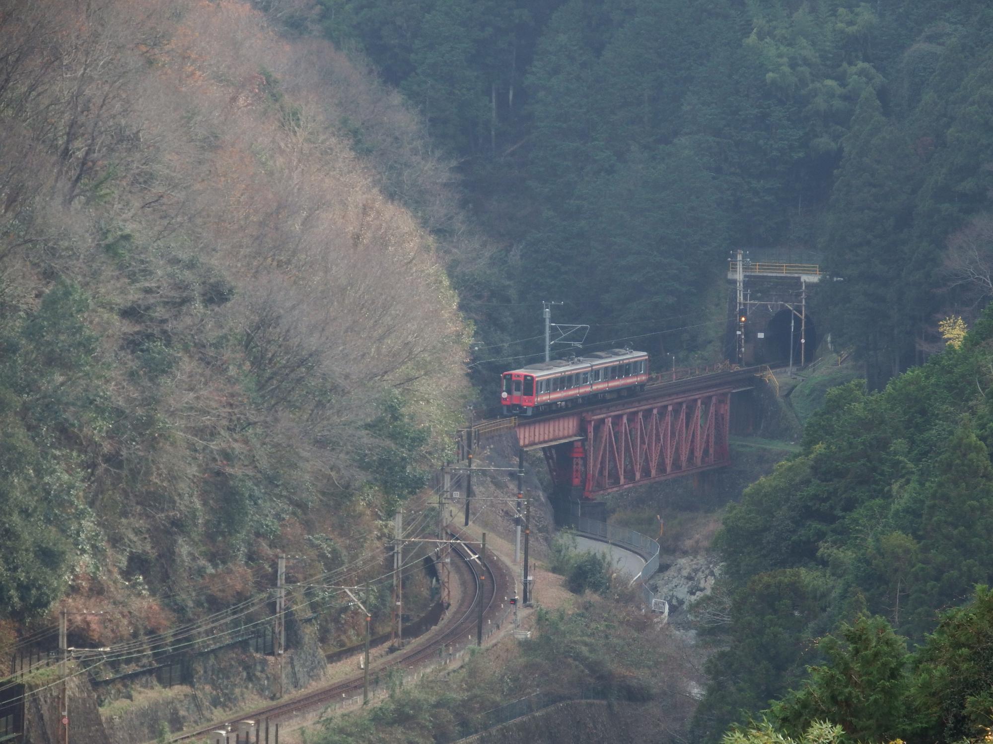 丹生川橋梁を行く黒こうや、一番狙っていたポイントですが、光線の具合で鉄橋付近は靄ったようになっています。やはり俯瞰撮影、一筋縄ではいかないようです。
