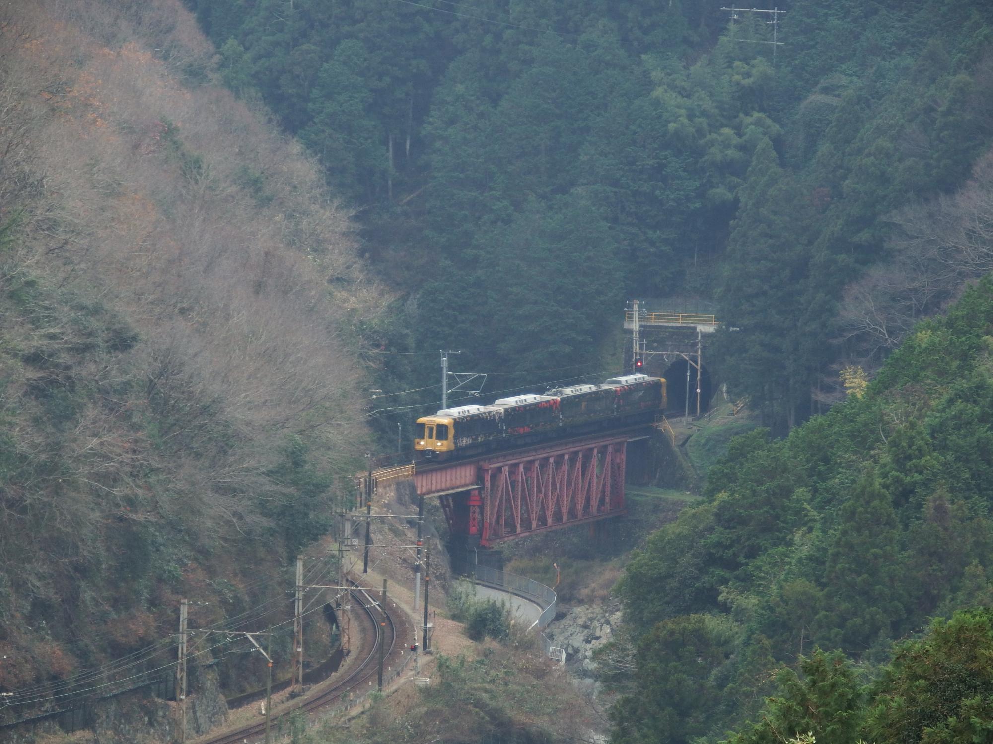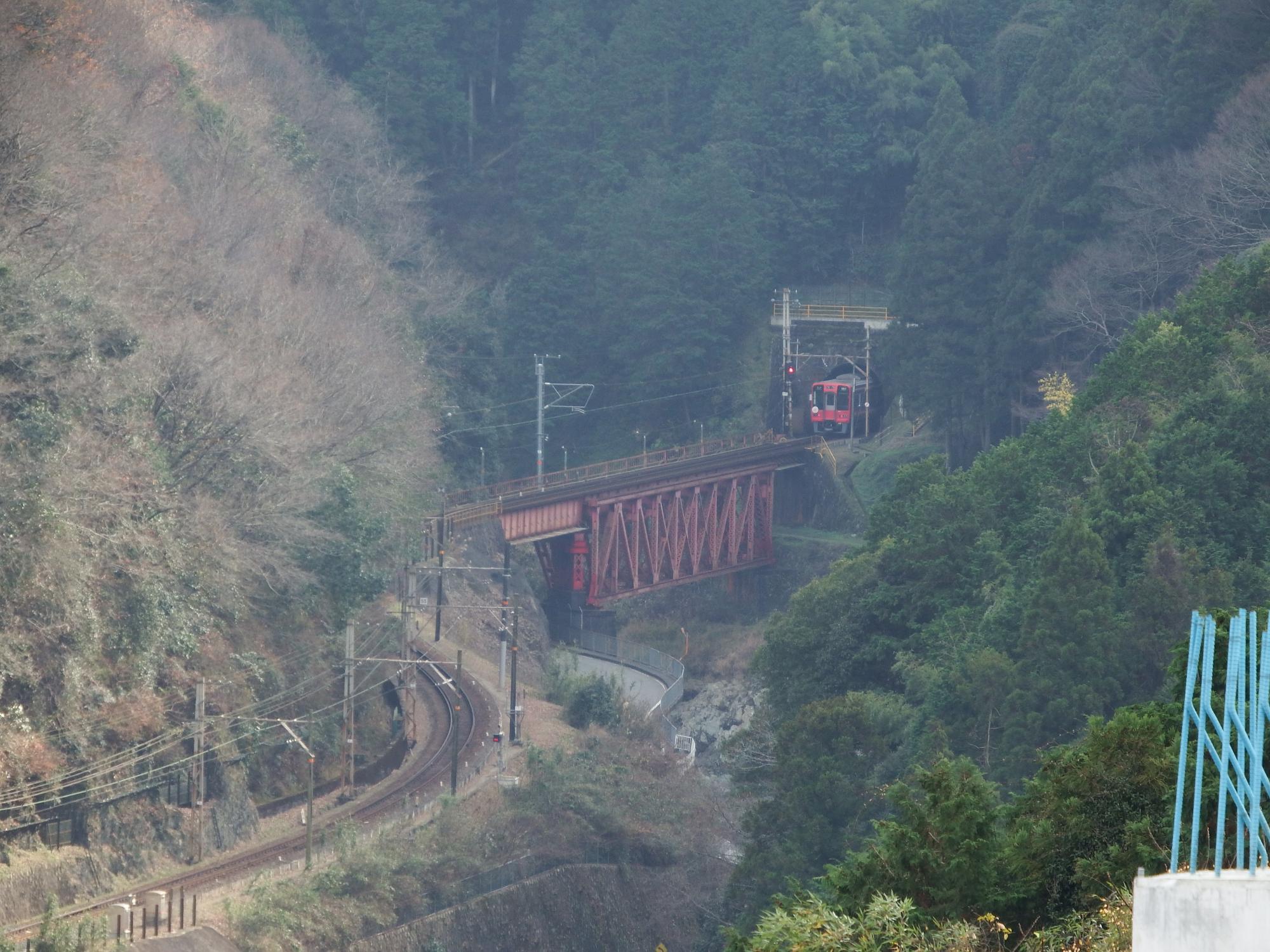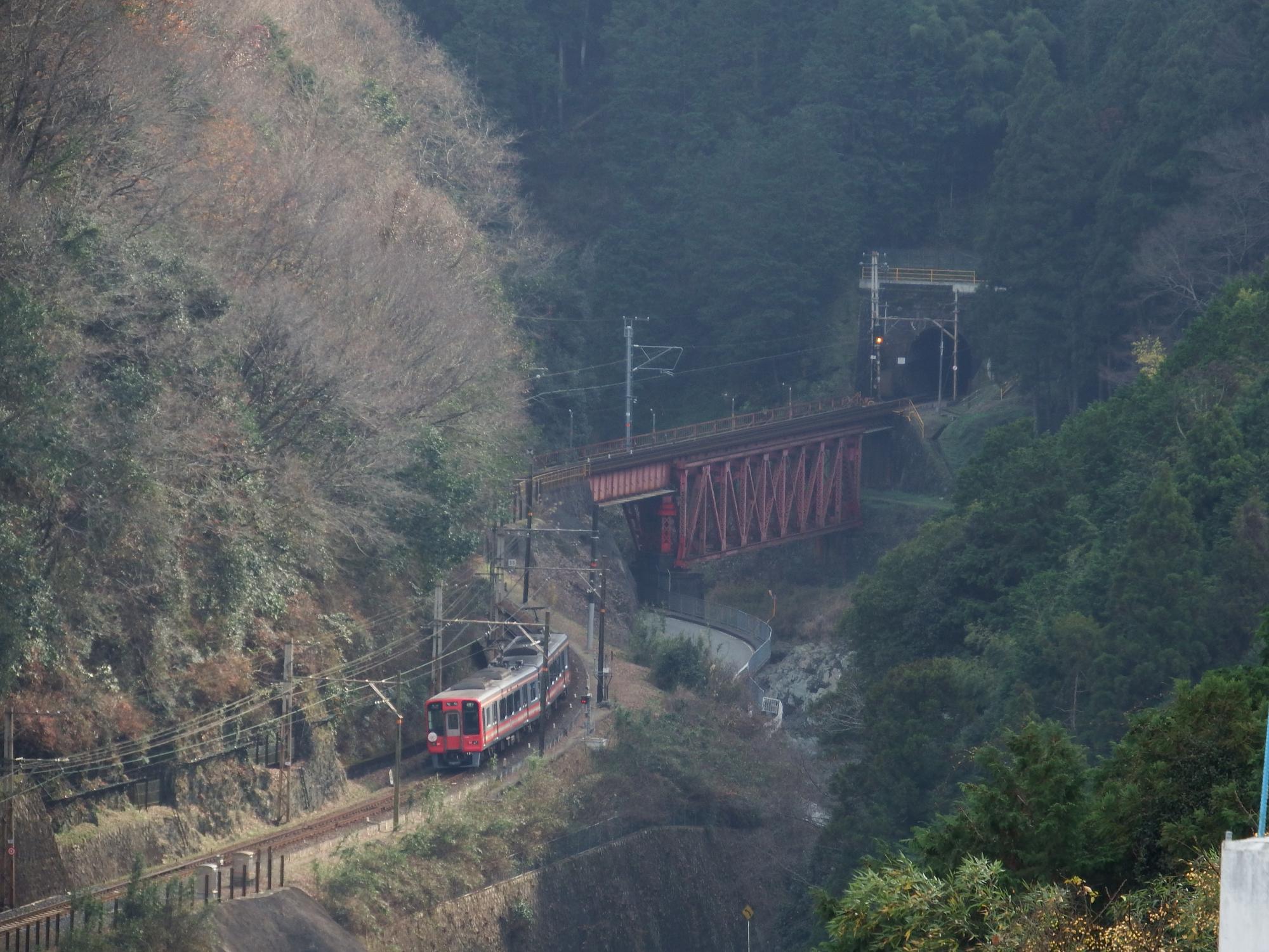 丹生川橋梁を行く黒こうや、一番狙っていたポイントですが、光線の具合で鉄橋付近は靄ったようになっています。やはり俯瞰撮影、一筋縄ではいかないようです。