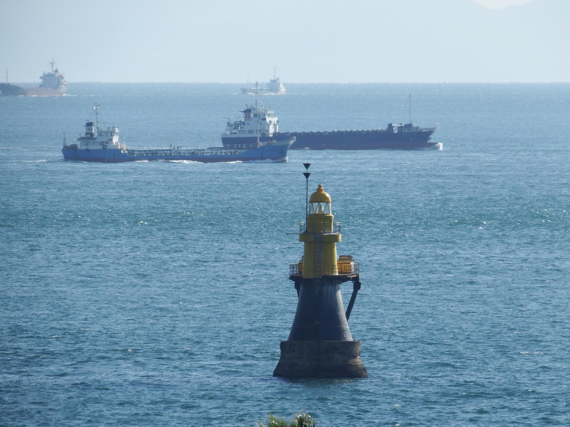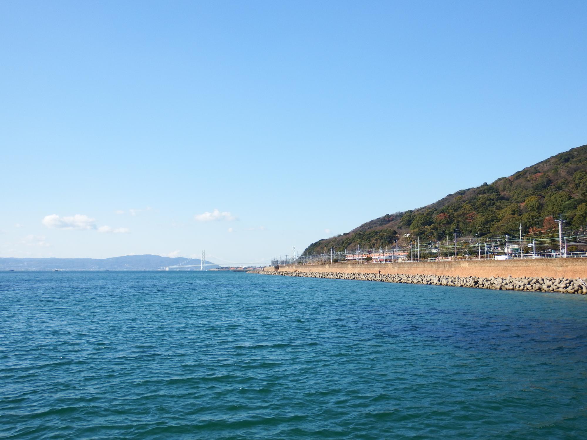 東垂水駅も崖の上ですが、海側から陸橋でつながっていました。東垂水もとても眺めのいい駅。古風な黄色い灯台は平磯灯台、明治26年に建てられた日本で最初のコンクリートの灯台で、サマセット・モームの短編小説の題材にもなっているそうです。淡路島側の街並みまでよく見えます。