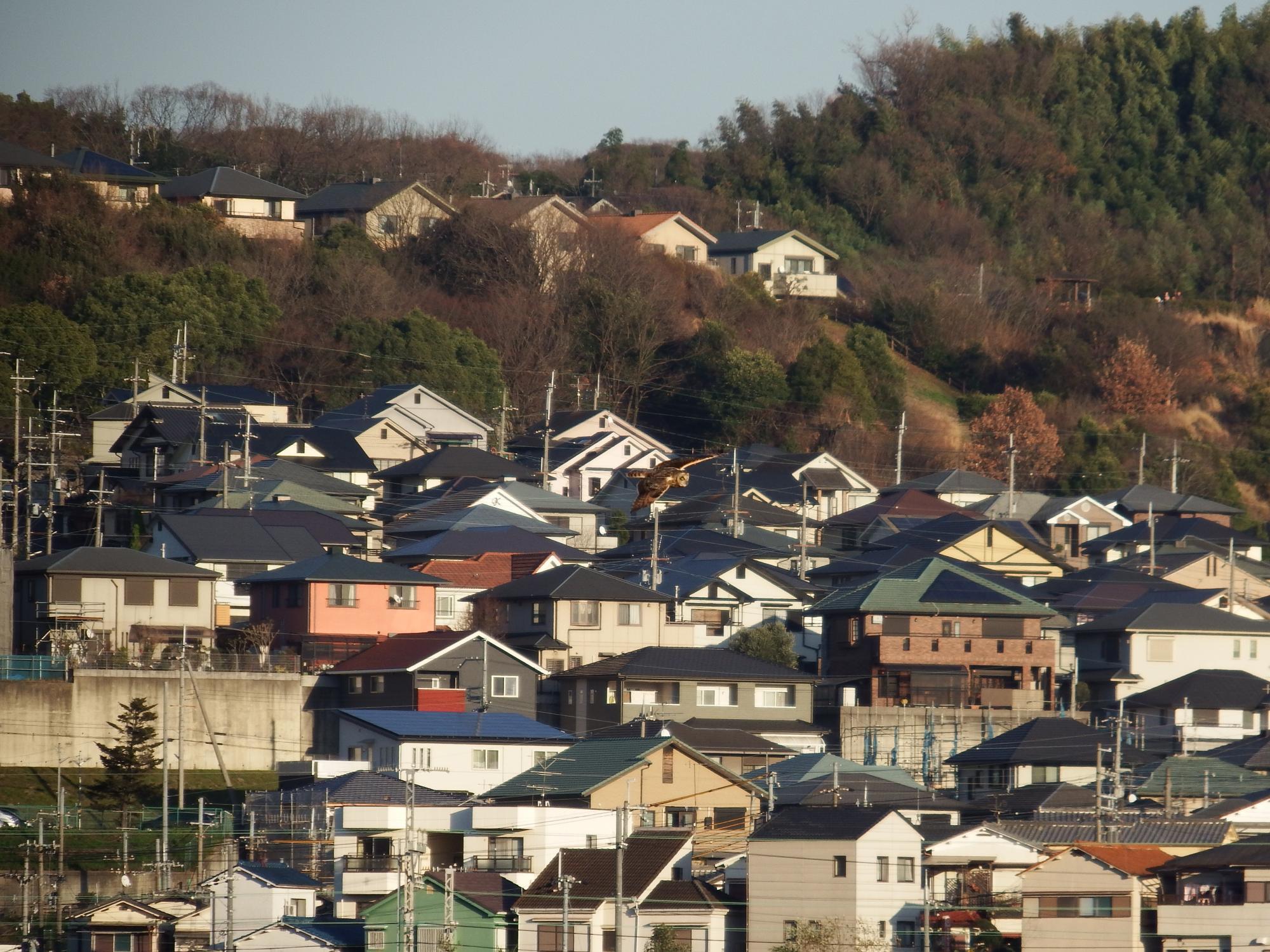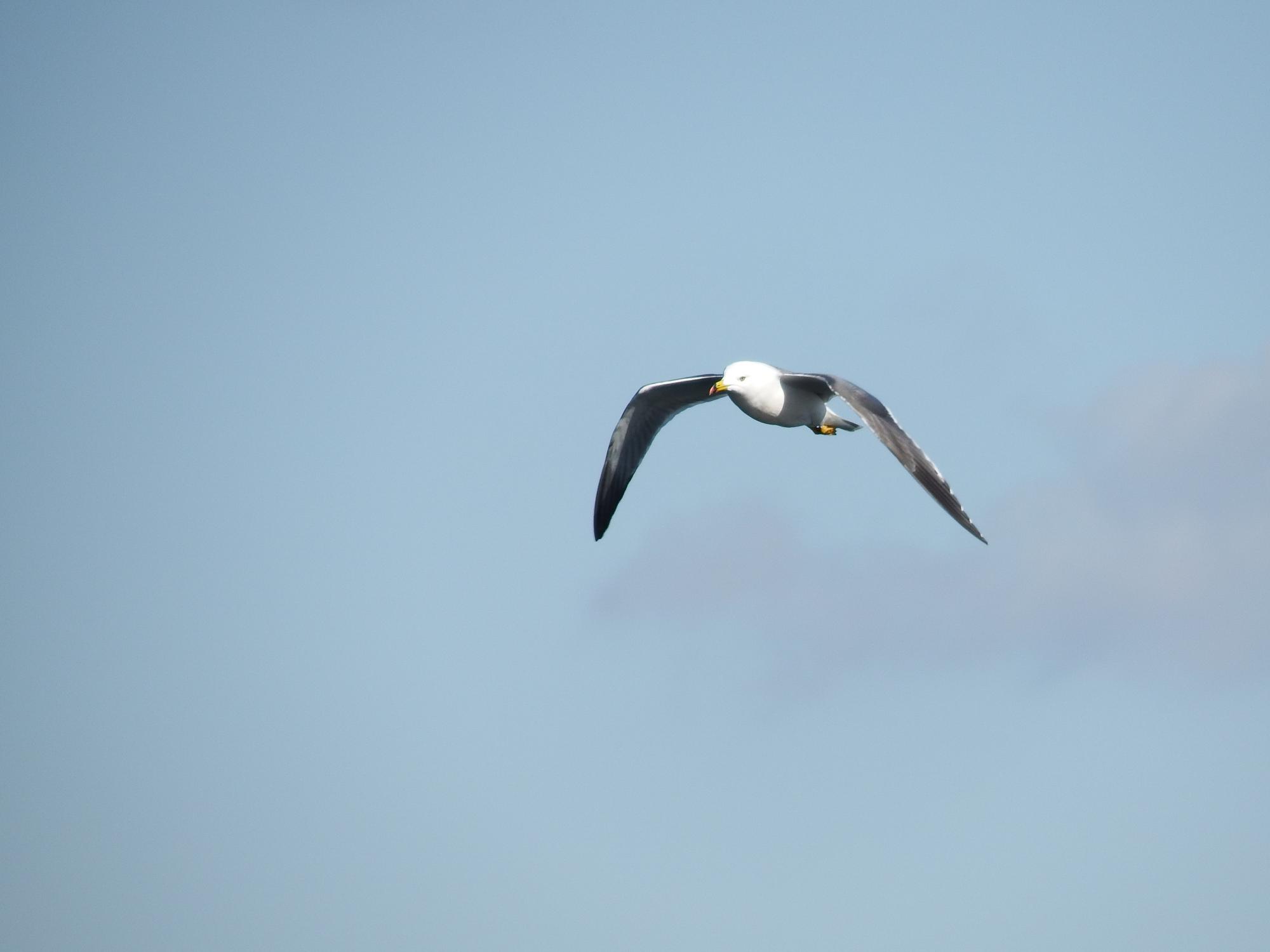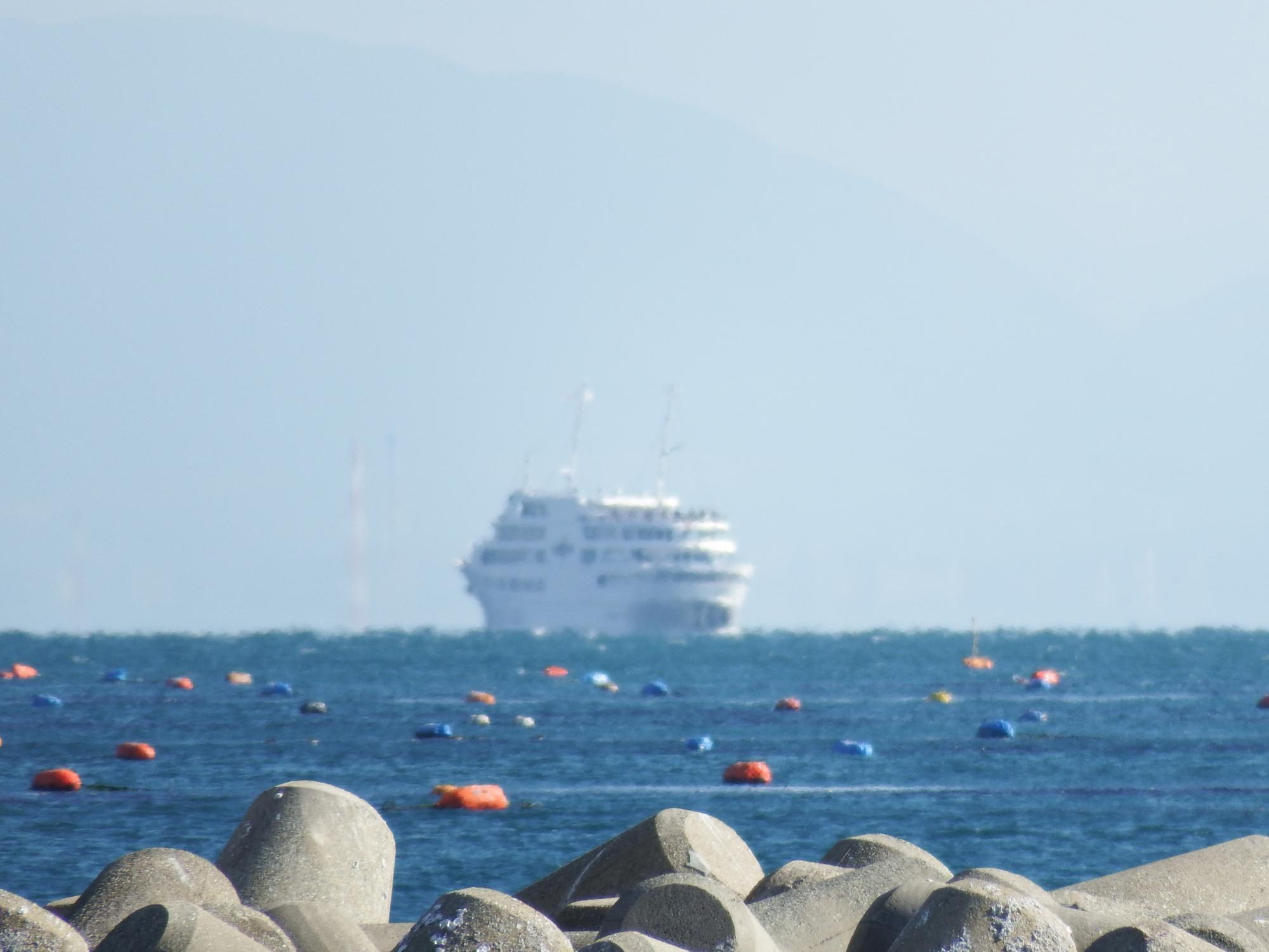 塩屋漁港辺り、トンビが多いです。検索した限りでは、テトラポッドの防波堤の向こう、ブイが並んでいるあたりに、カツオドリがいたと推測されます。