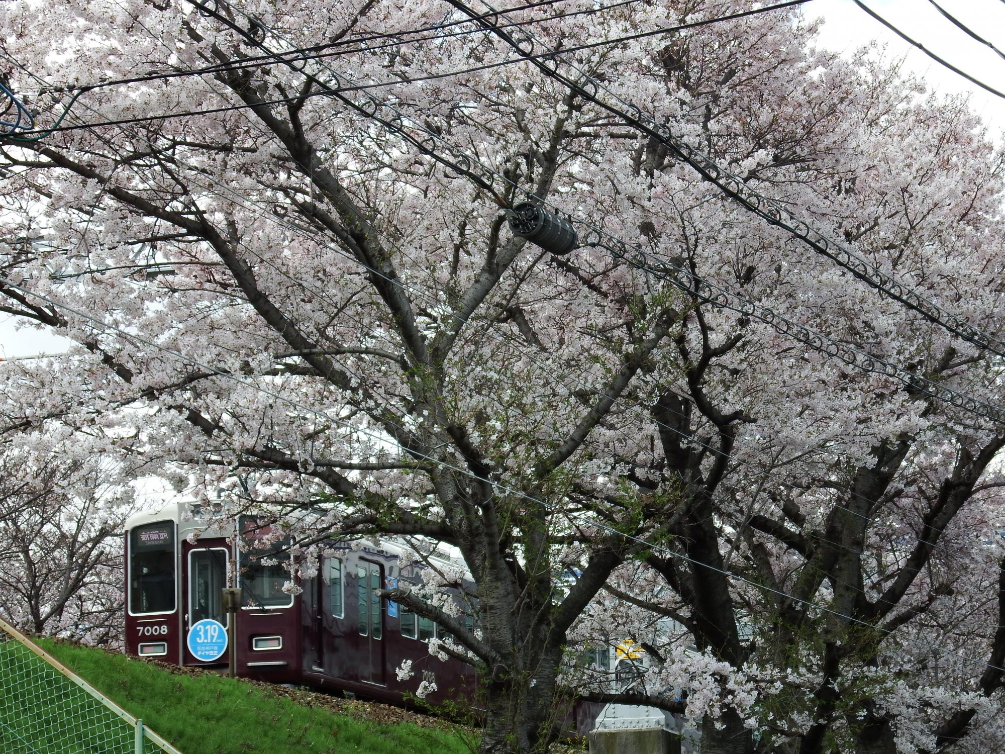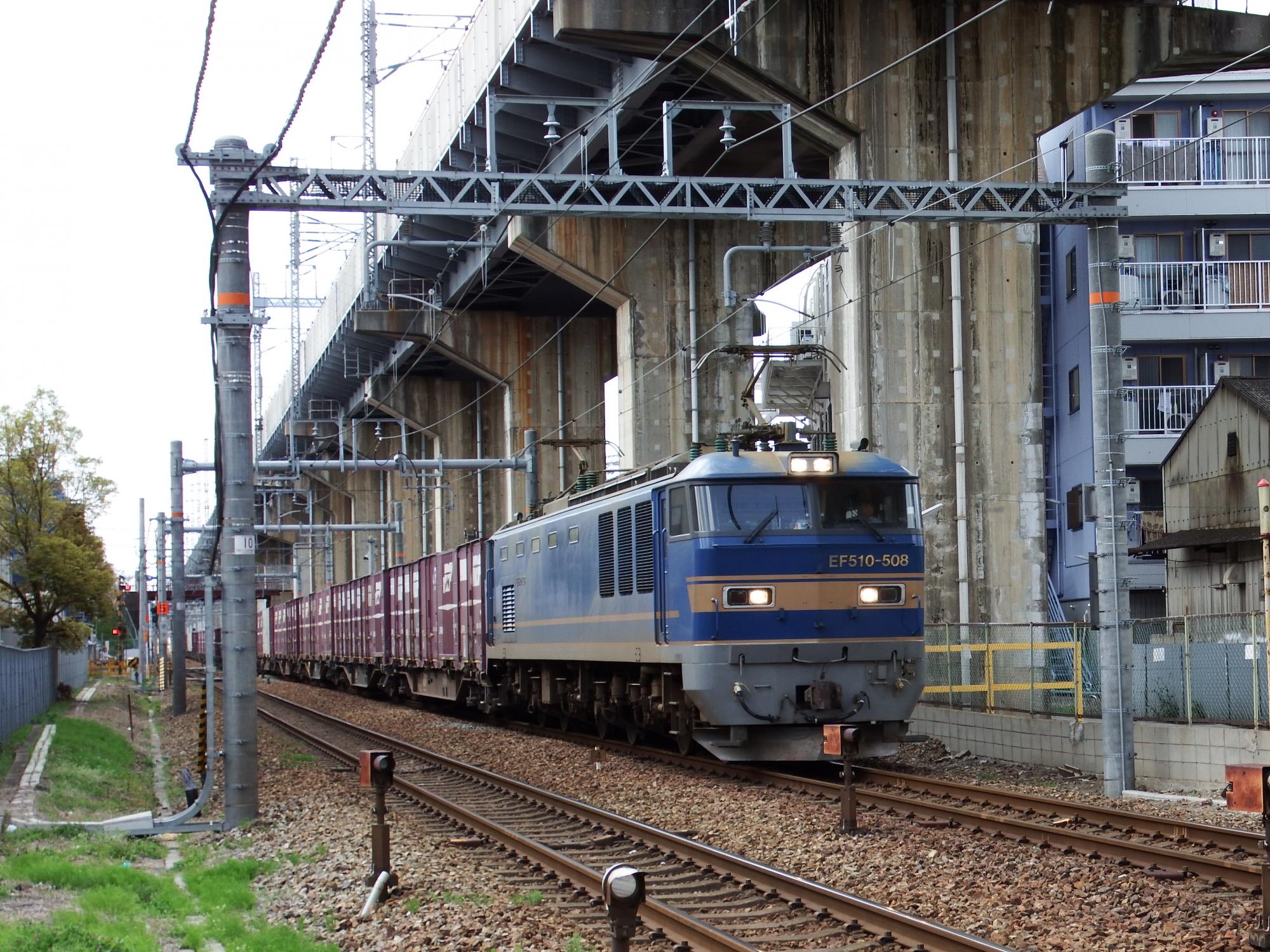 北方貨物線のEF510-508号機、元「北斗星」牽引機!阪急神戸線の築堤の桜も満開。