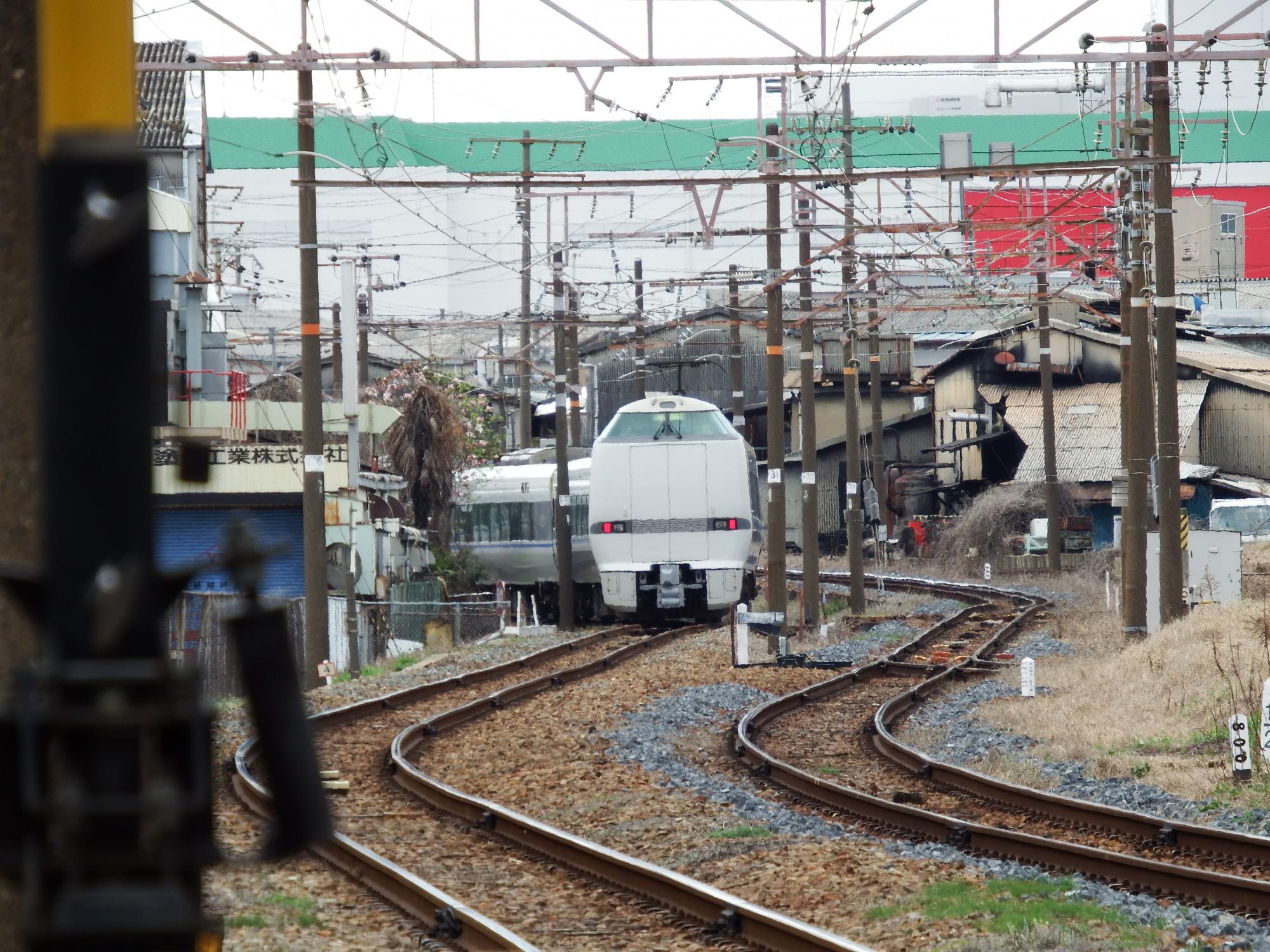 デルタ線分岐点の三津屋街道踏切。サンダーバード回送がS字カーブを描きながら大阪駅へ向かいます。かなり萌える場所です。