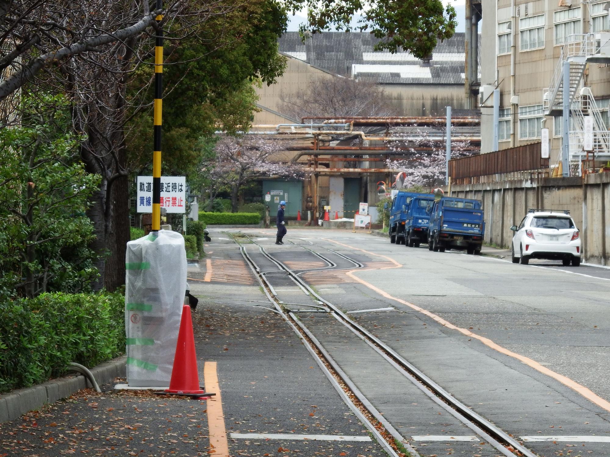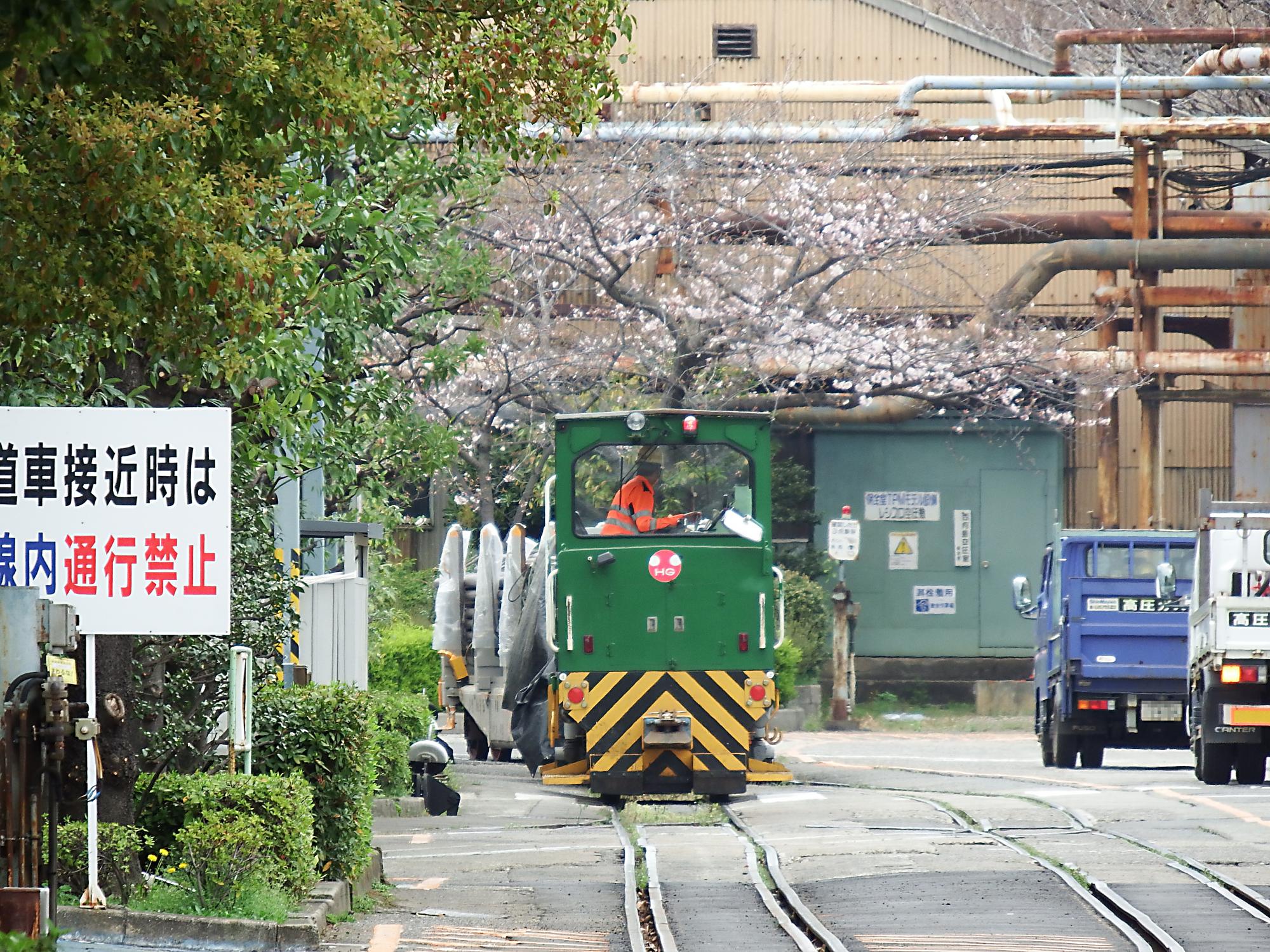 尼崎までやってきた目的地、新日鉄住金尼崎製造所です。工場内の物資運搬用のナローゲージの専用軌道が県道を渡っています。