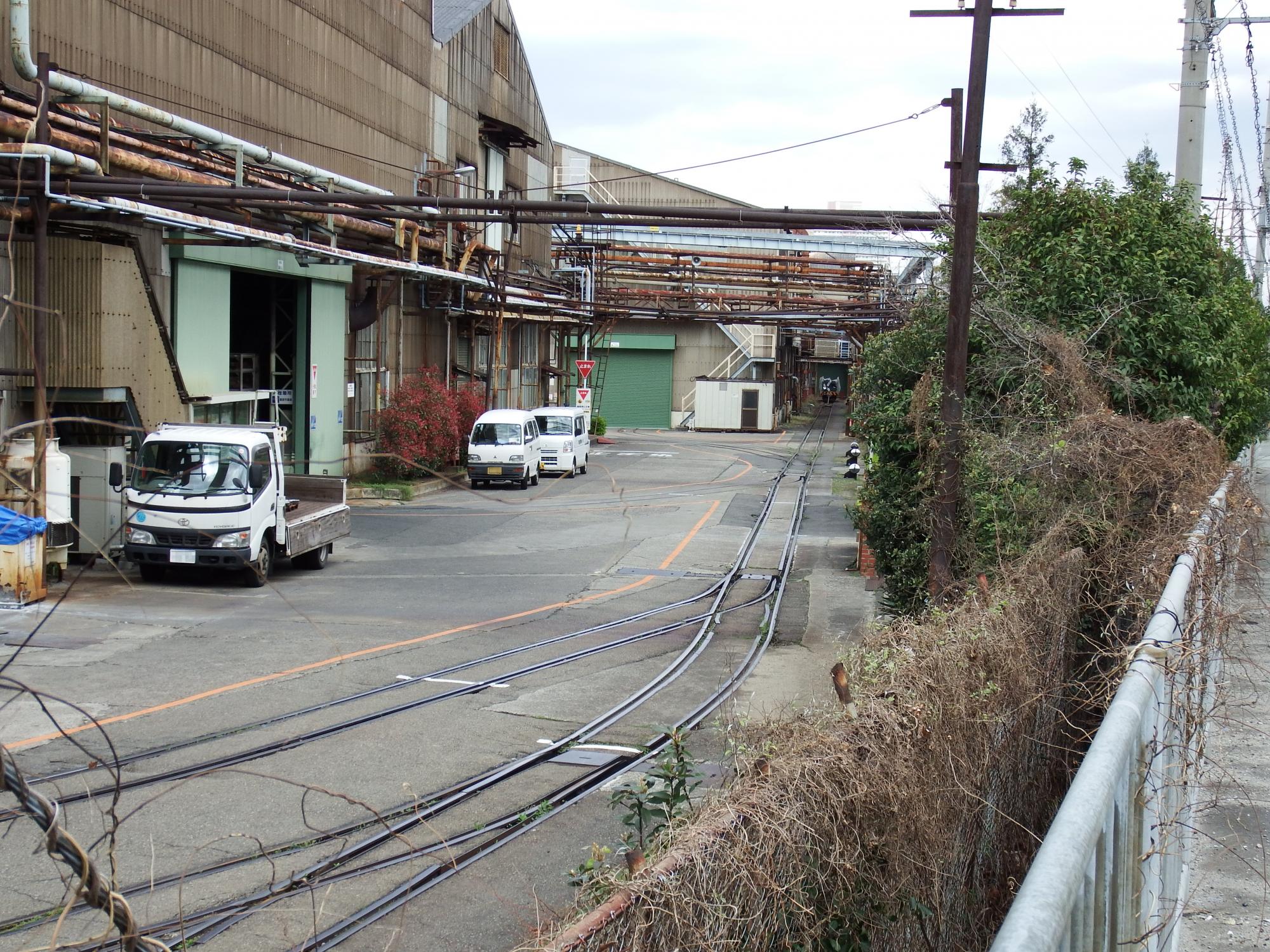 もう少し先まで行ってみると工場内に分岐するレール、手動転轍機も見えます。Google Mapで見てみると、工場内に線路が張り巡らされているのが確認できます。