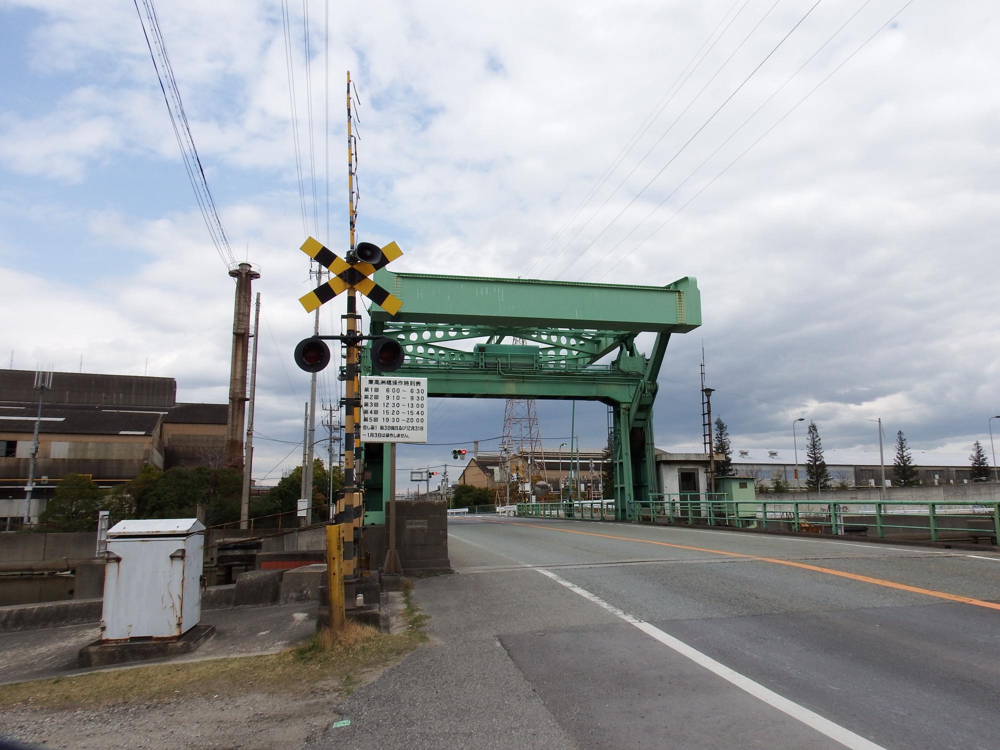振り返ると変な踏切が。廃線跡かなと思ったら軌道跡らしきものも見あたりません。川の反対側に渡ってみてこの橋が可動橋で踏切は橋が跳ね上げられたときのためと漸く分かりました。