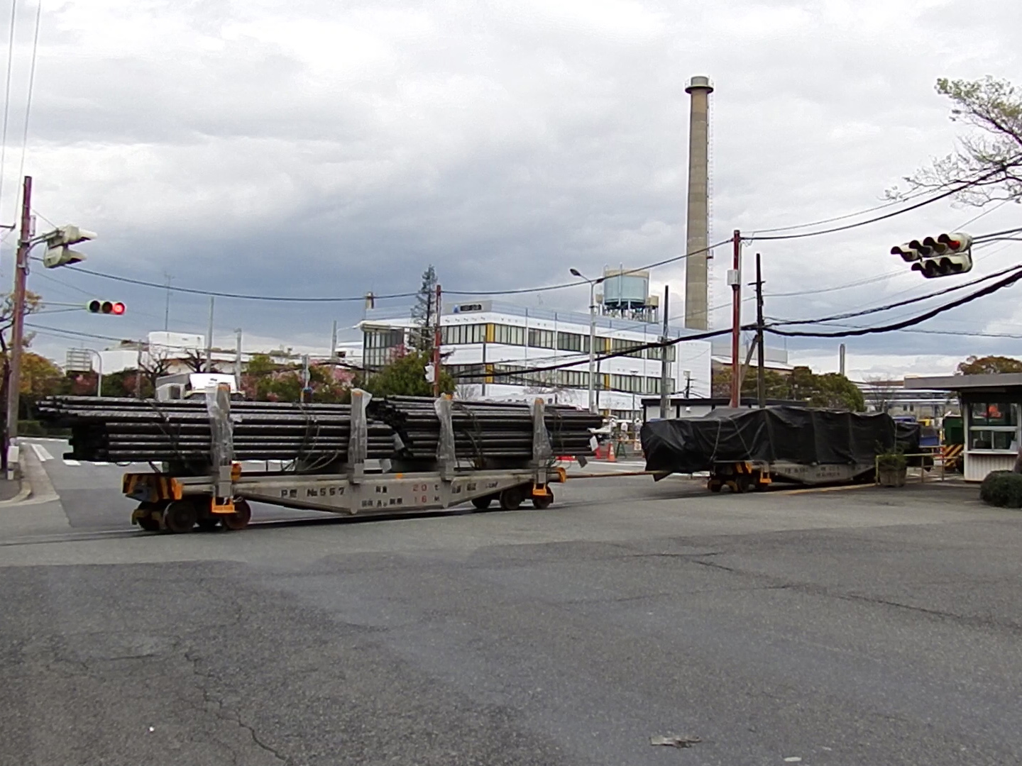 土曜日なので列車が動いているところが見られるとは全然期待していなかっただけに大興奮。長尺の鋼管を運ぶための長~いドローバーで連結されています。