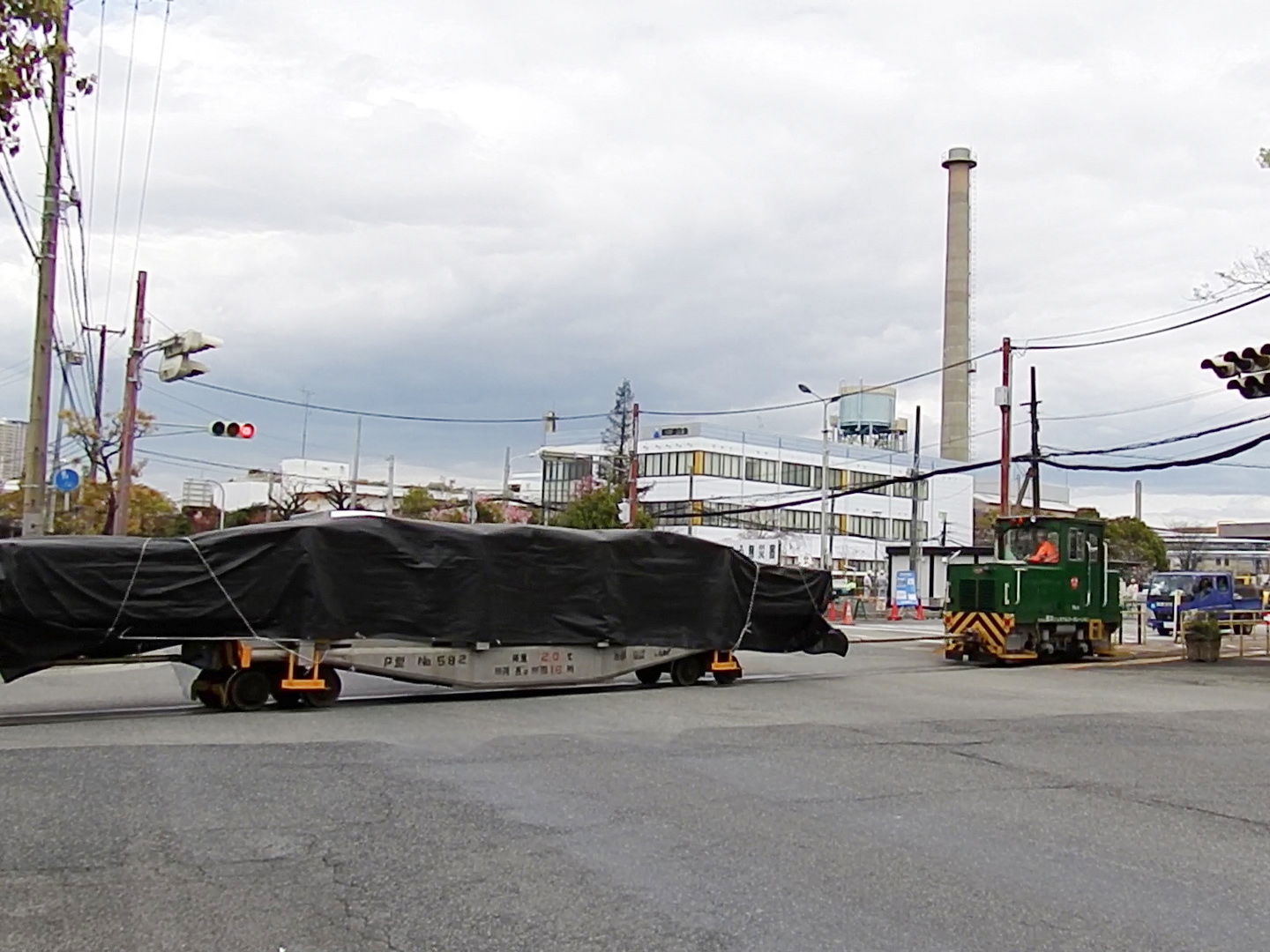 突然サイレンと「軌道車が通ります。ご注意ください。」との自動放送が聞こえ、鋼管を積んだ貨物列車が推進運転で県道を渡ってきました。