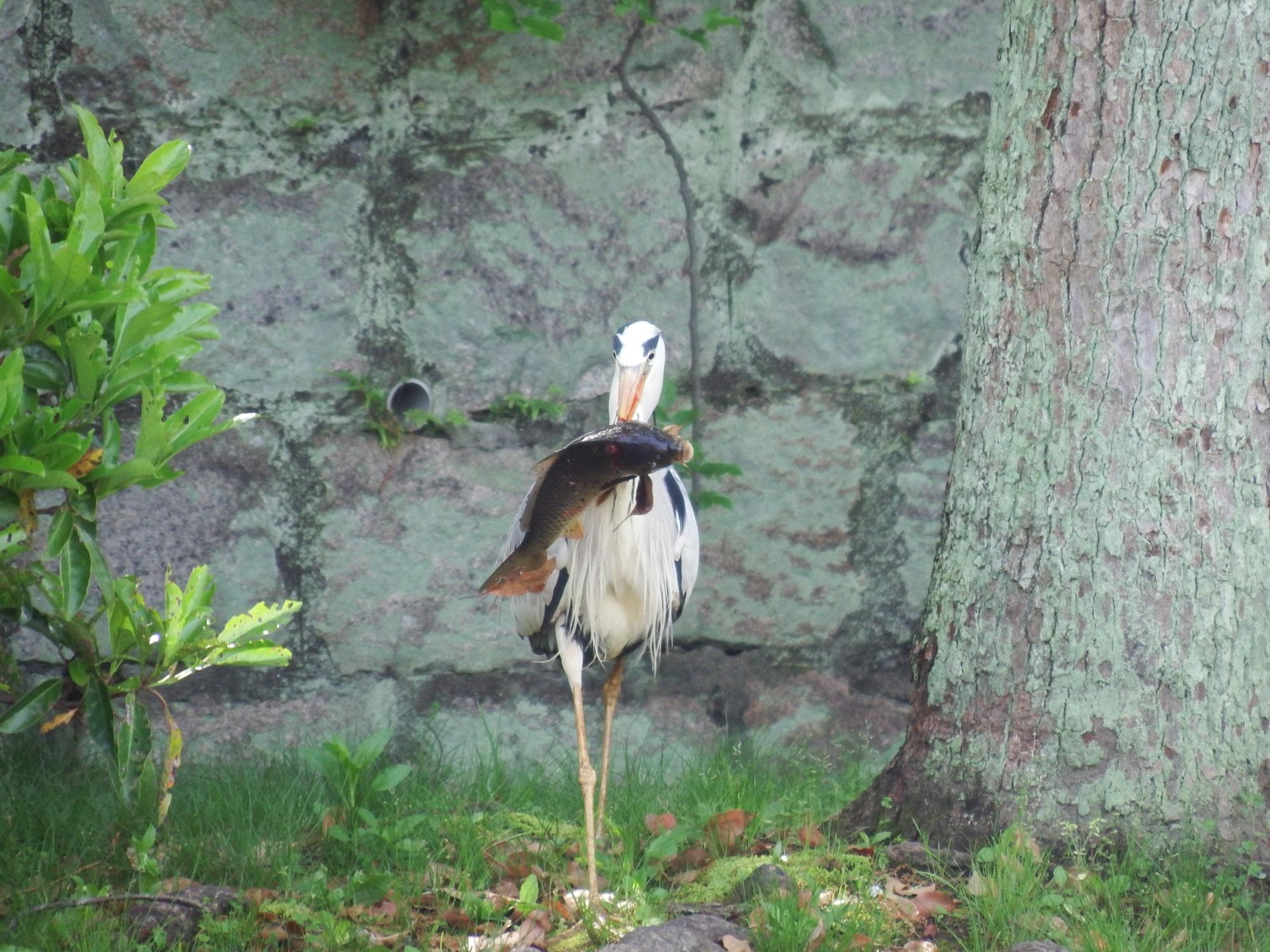 ひょうたん池の主アオサギくんが、でっかい鯉を捕まえてきました。一度地面に置いたものの、処理に困ったか鯉のエラを銜えて池に戻そうとしています。