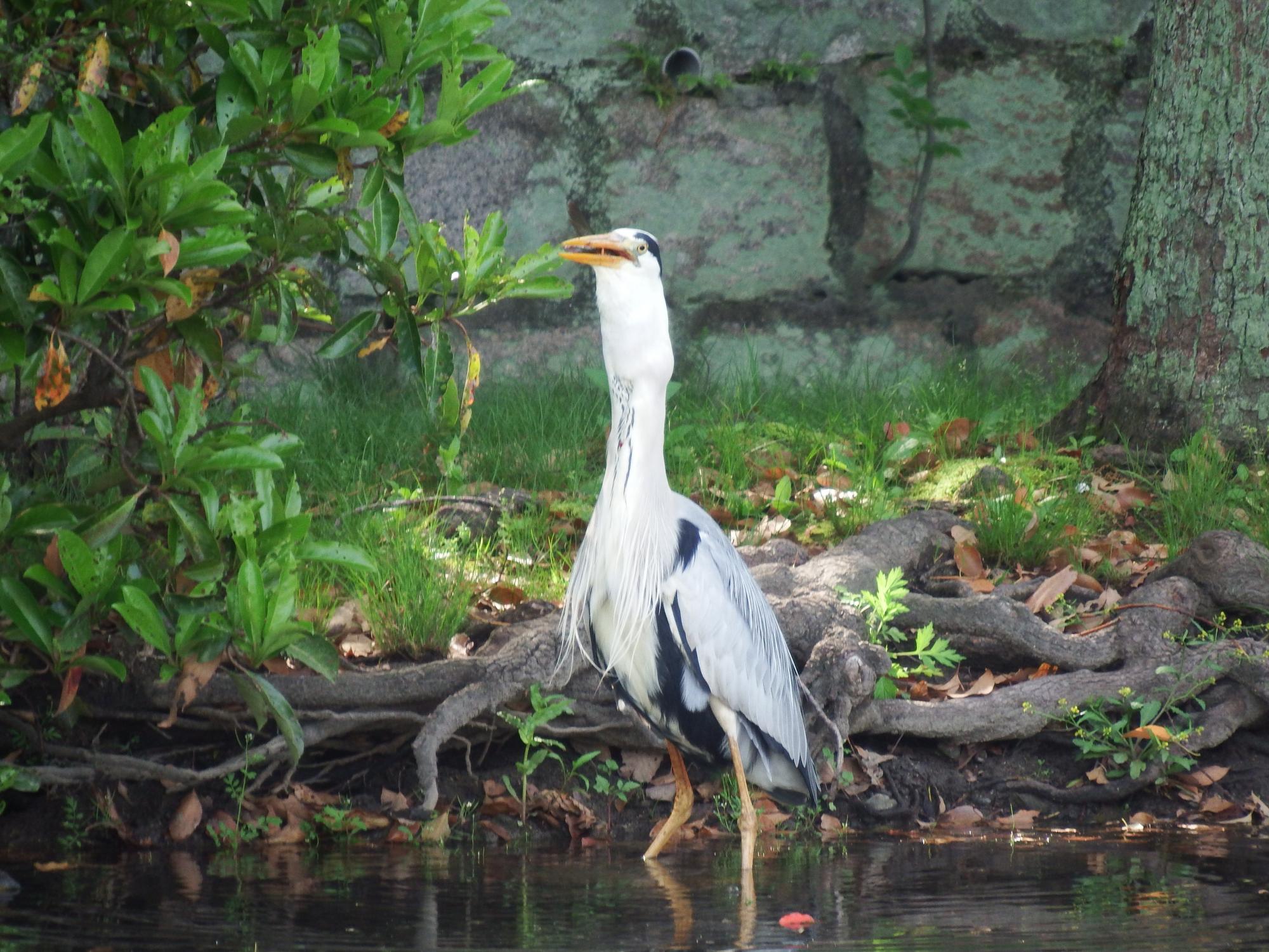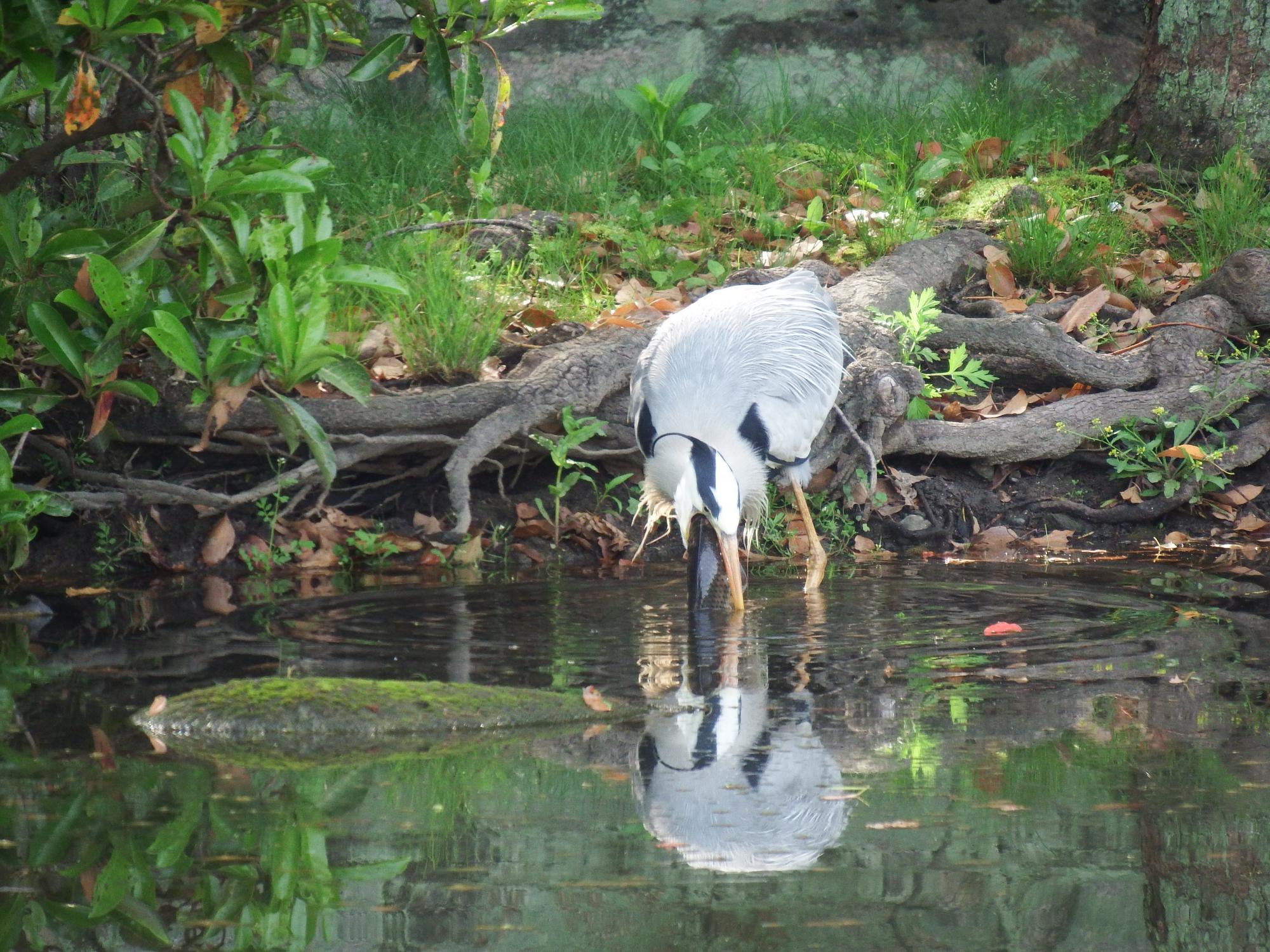 池に戻すんじゃなくて、銜え直すために池に運んできたとわかりました。嘴と鯉がまっすぐになったところで一気に飲み込みました。のどに突っかからないかと心配したものの、無事おなかに流れ込んだようです。鳥の世界でダントツのひょうきんものですが、かなり頭が良いです。