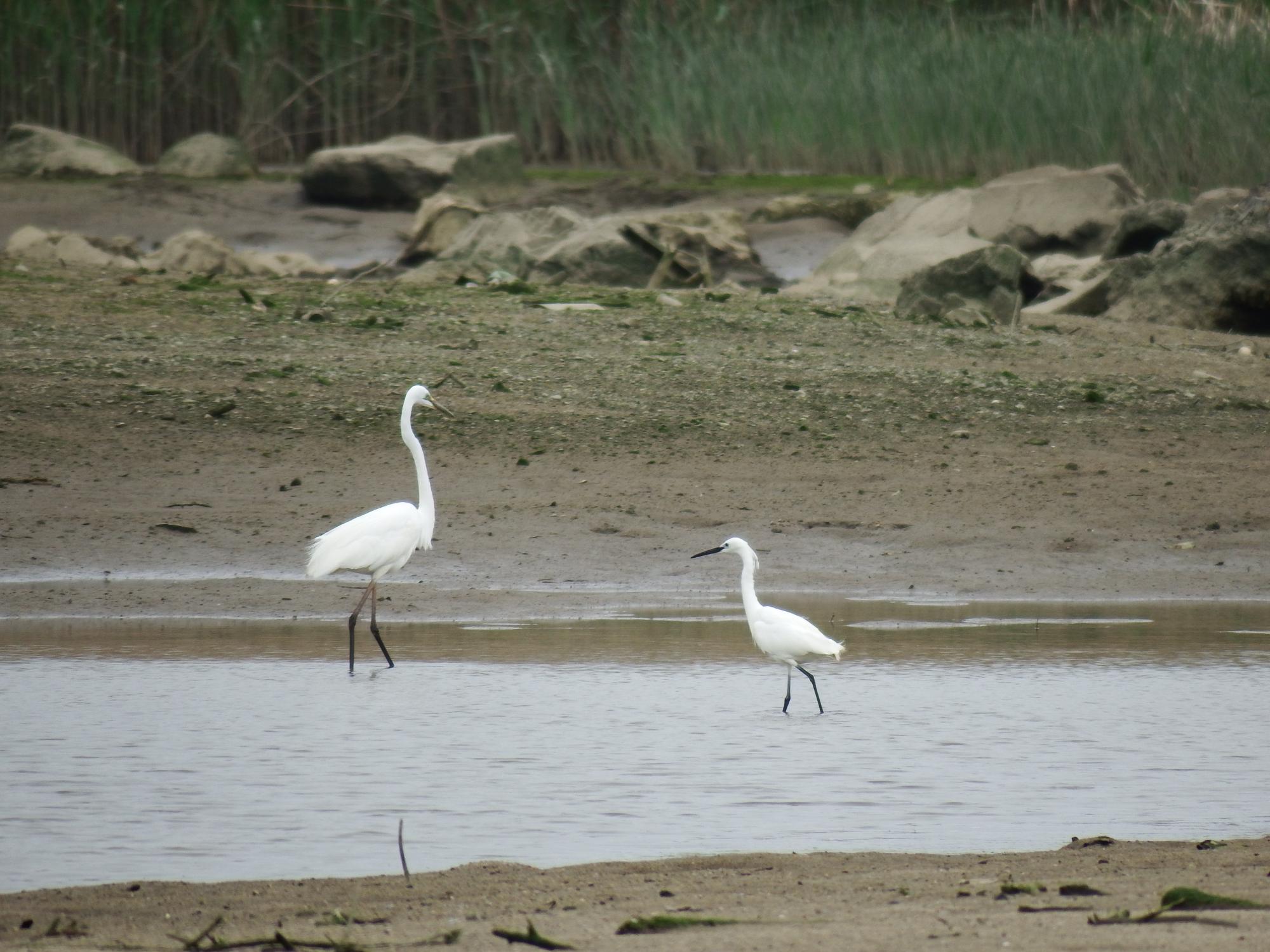 いつものように、ぼっちのイソシギと、一方ずっと一緒のダイサギとコサギ。