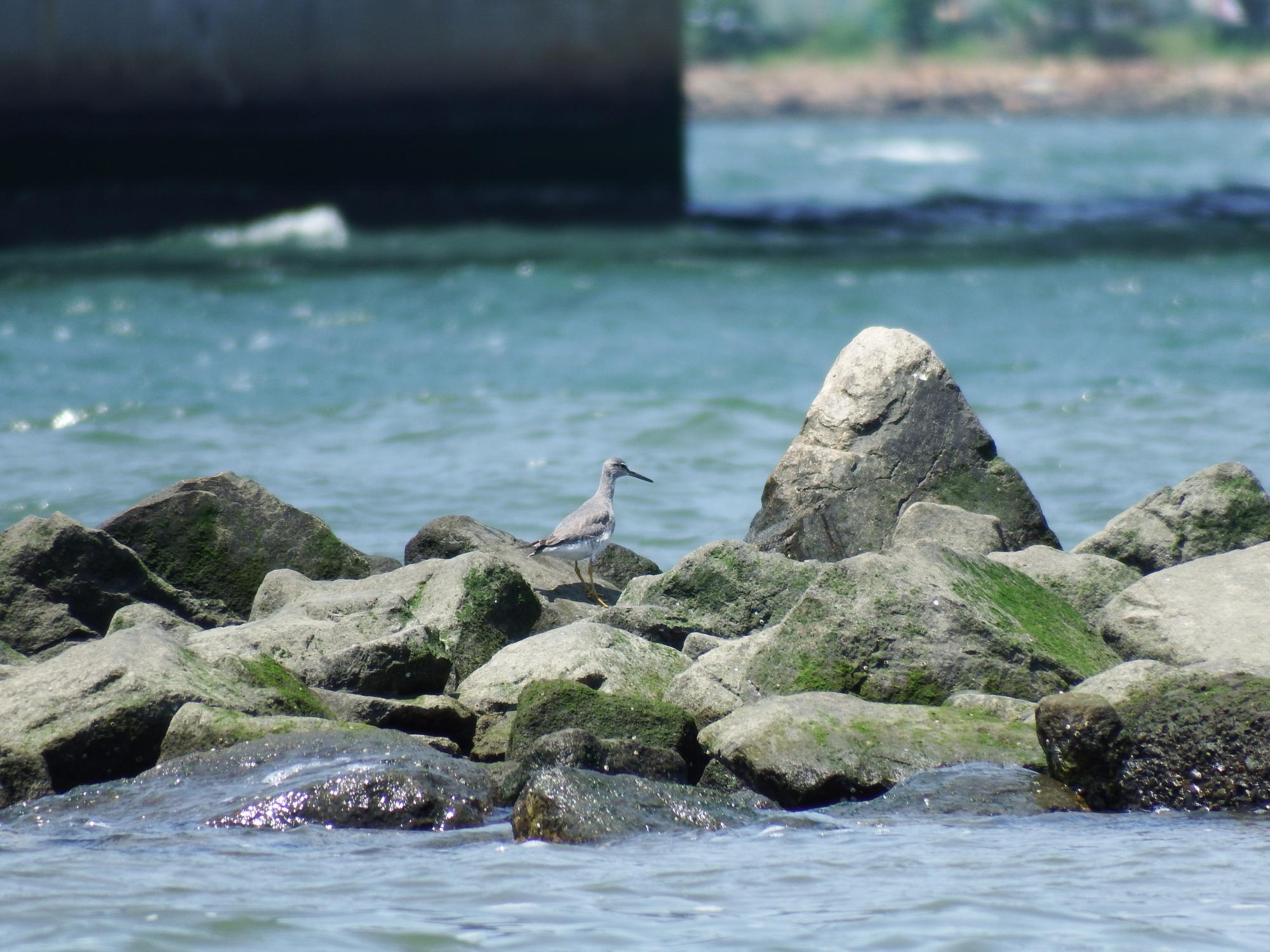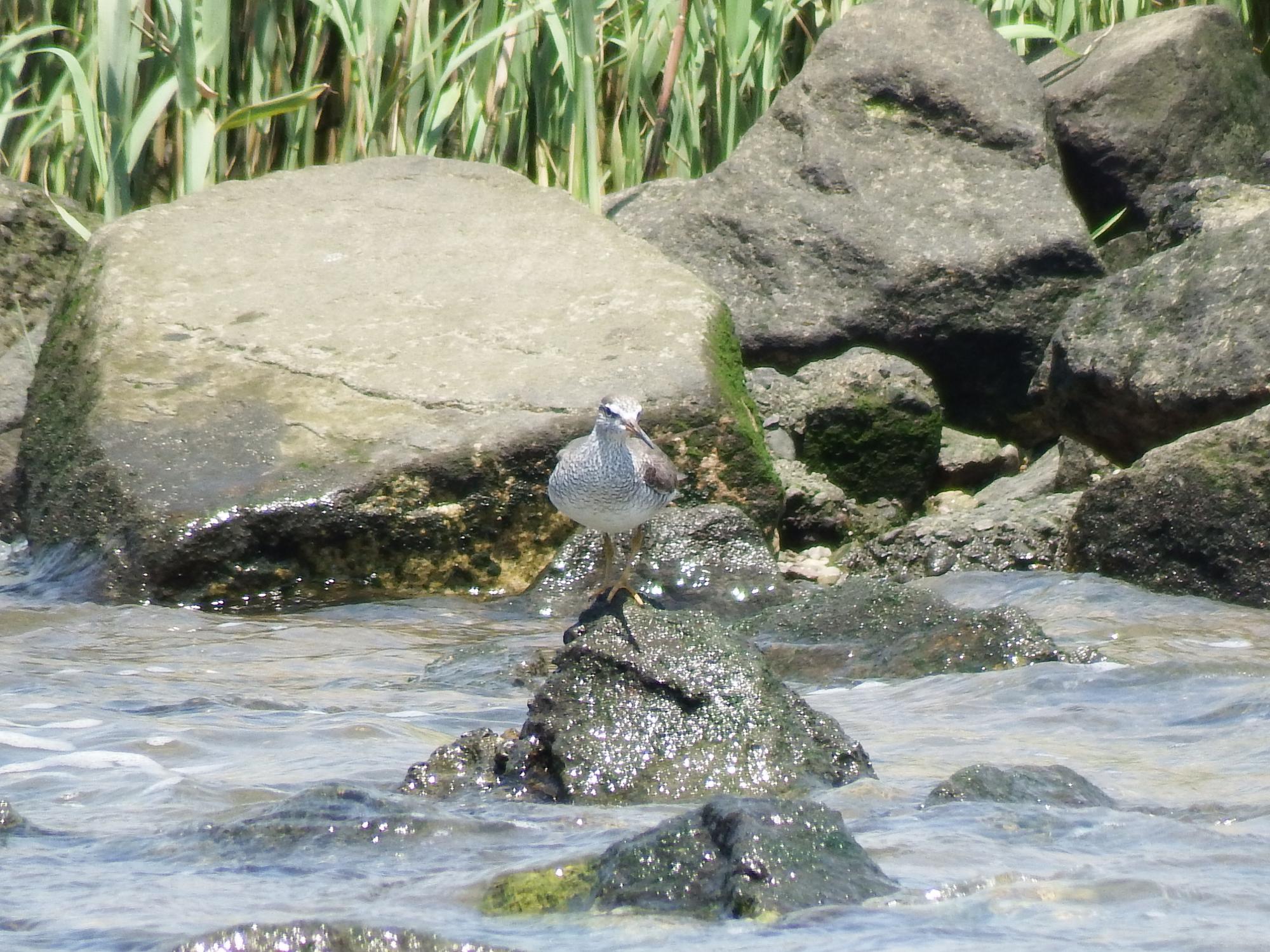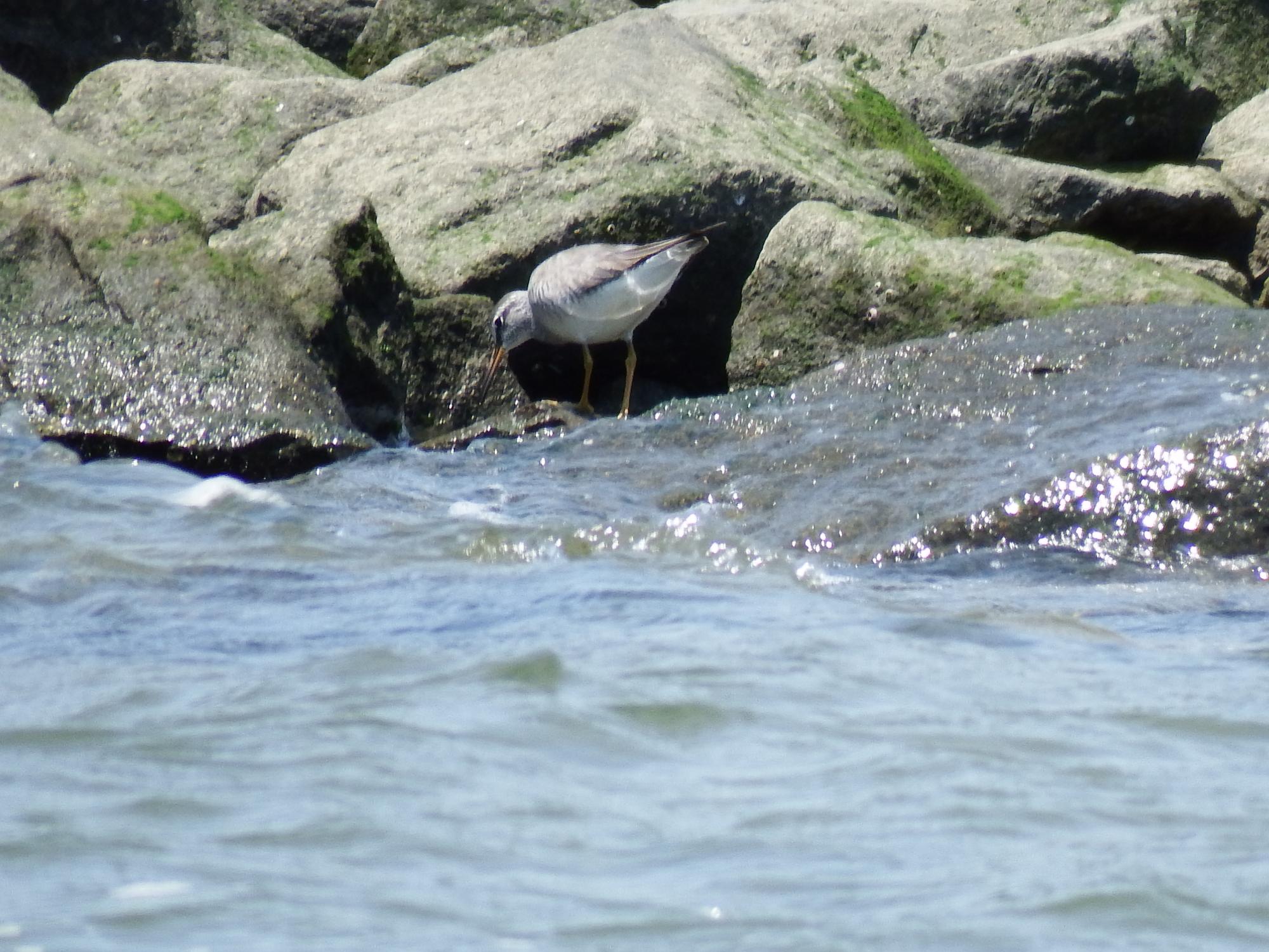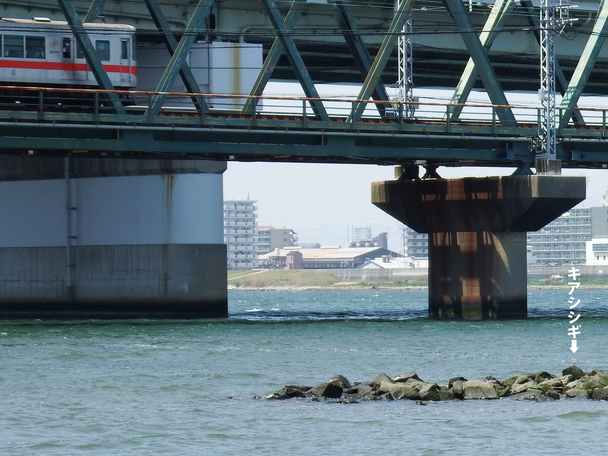 海老江へ移動、潮位は高めですが鉄橋脇の磯にキアシシギ。