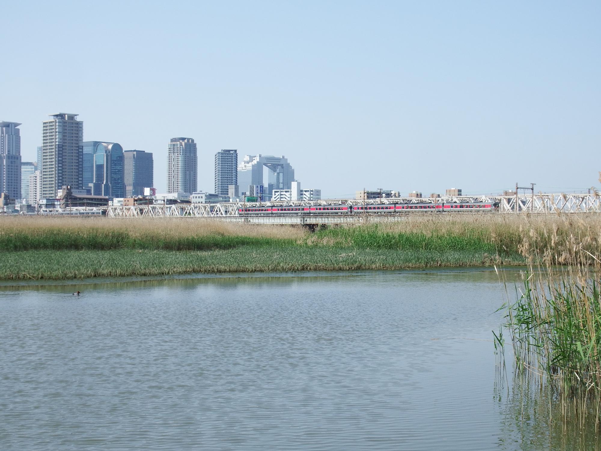 はまかぜとホシハジロ、はまかぜは宮原から大阪駅への送りこみ回送、ゴールデンウイークなので6両編成。