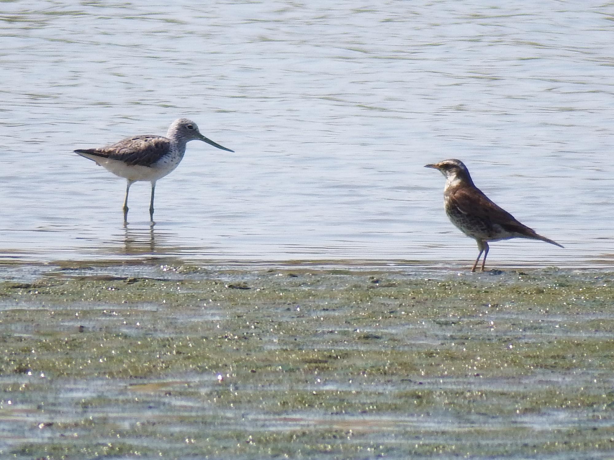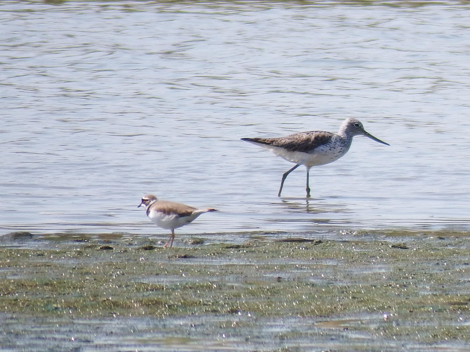 アオアシシギとコチドリ、大きさの比較が分かりやすい。