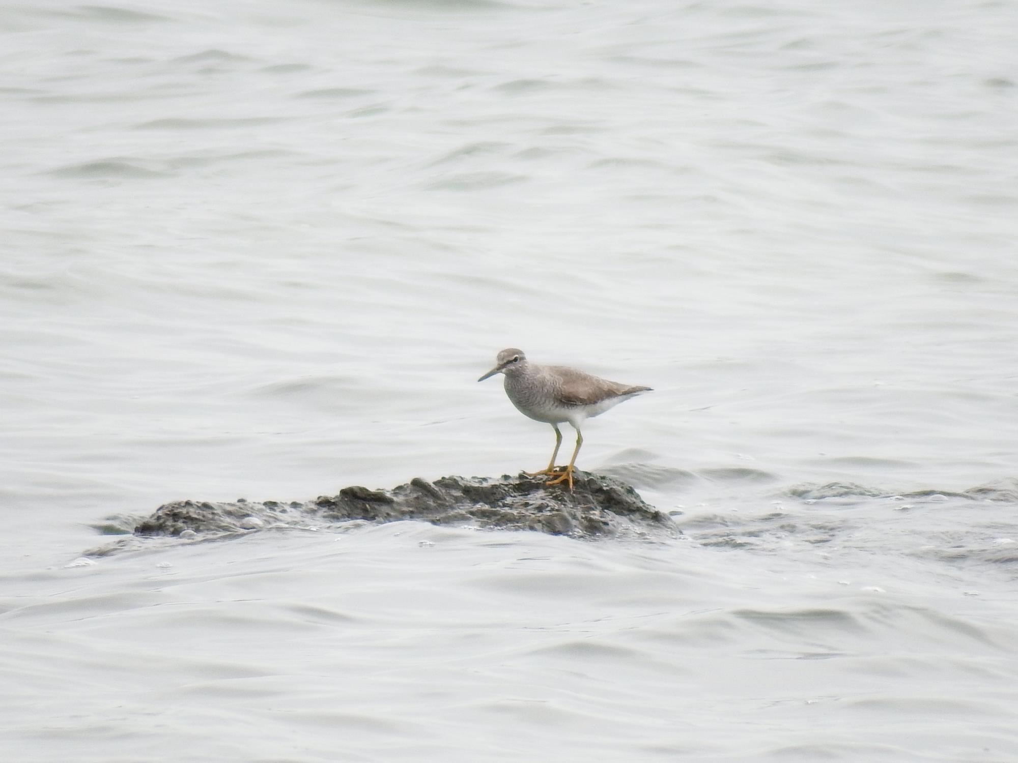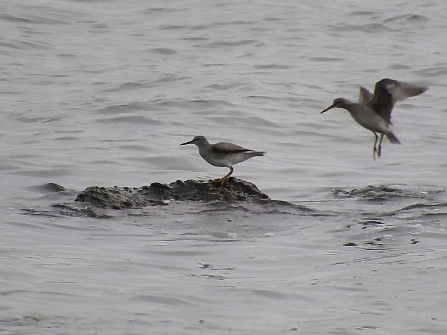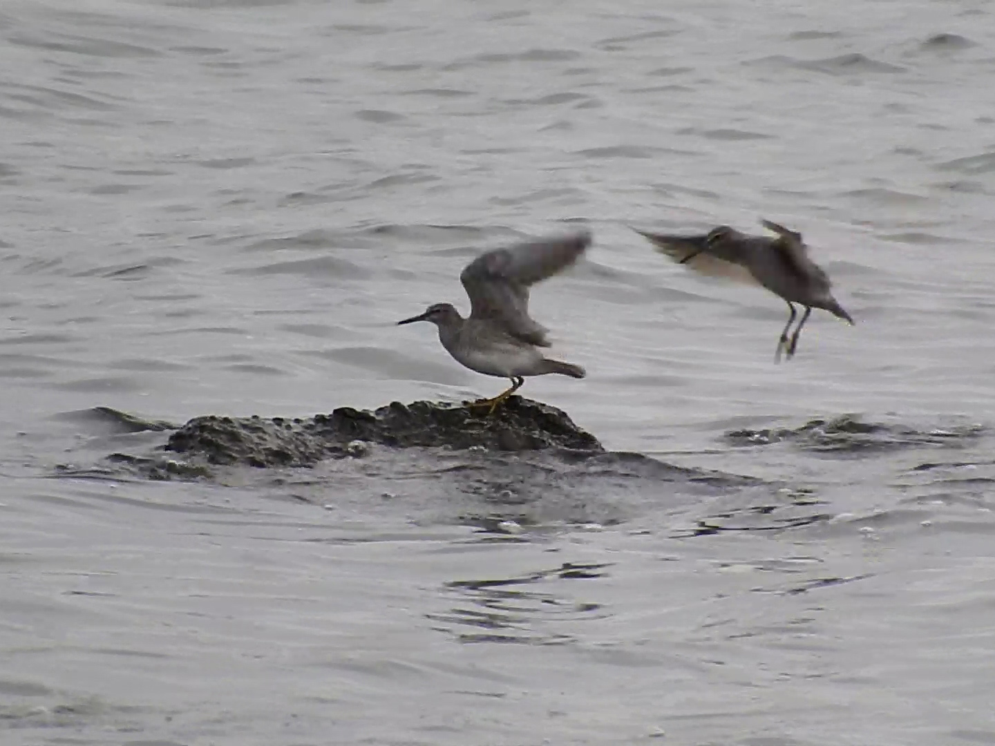 ピーピーと鳴きながらキアシシギた飛んできて、向こうへ行ってしまったと思ったら戻ってきて、わずかに頭を出した磯に下りてくれました。