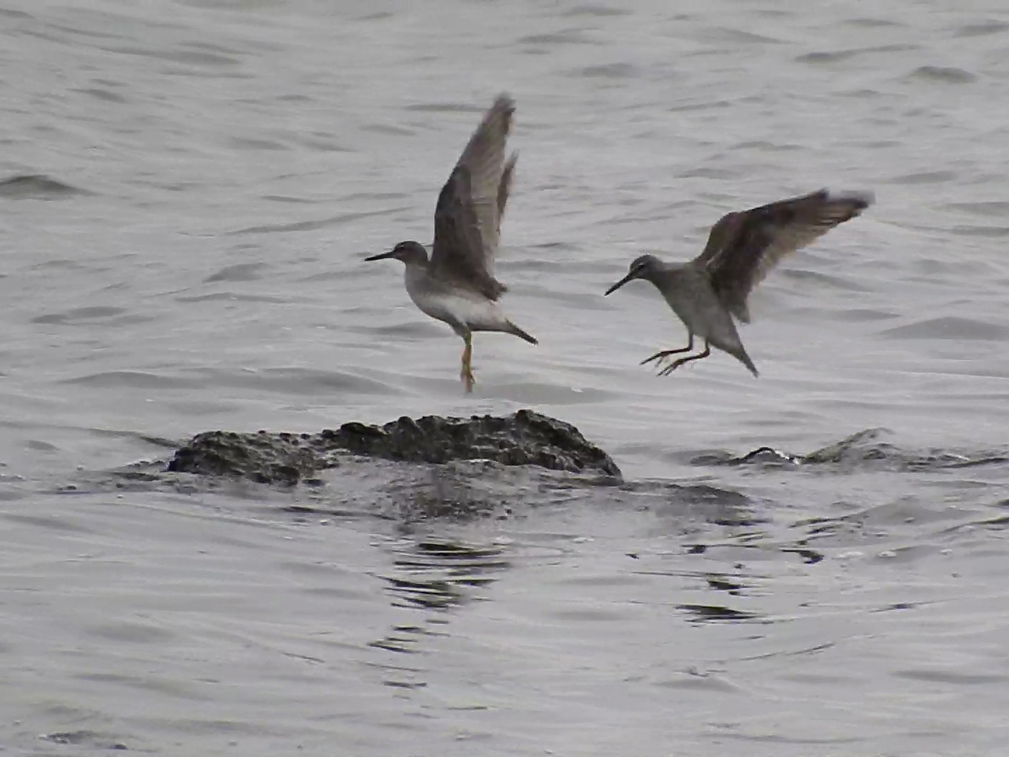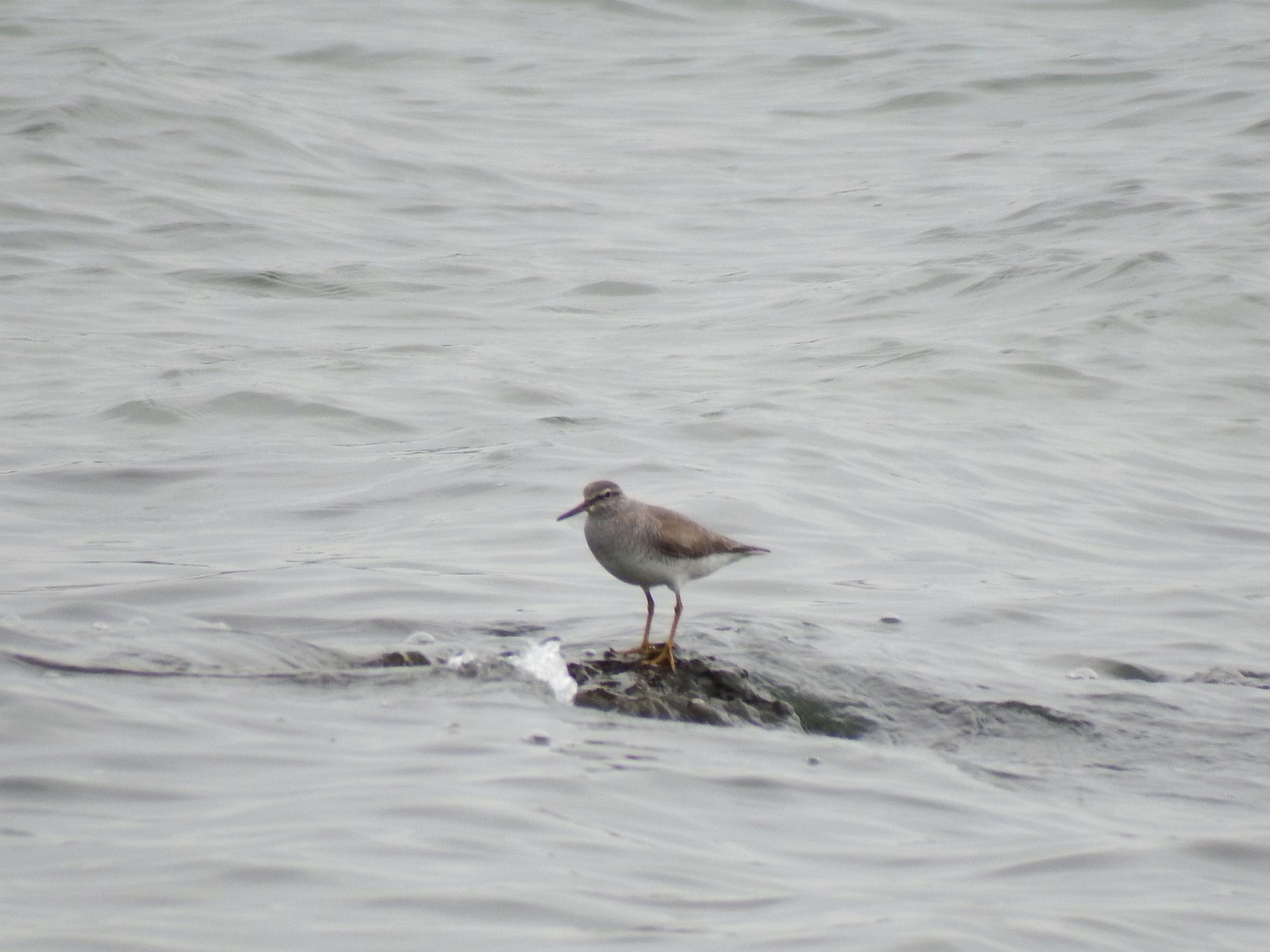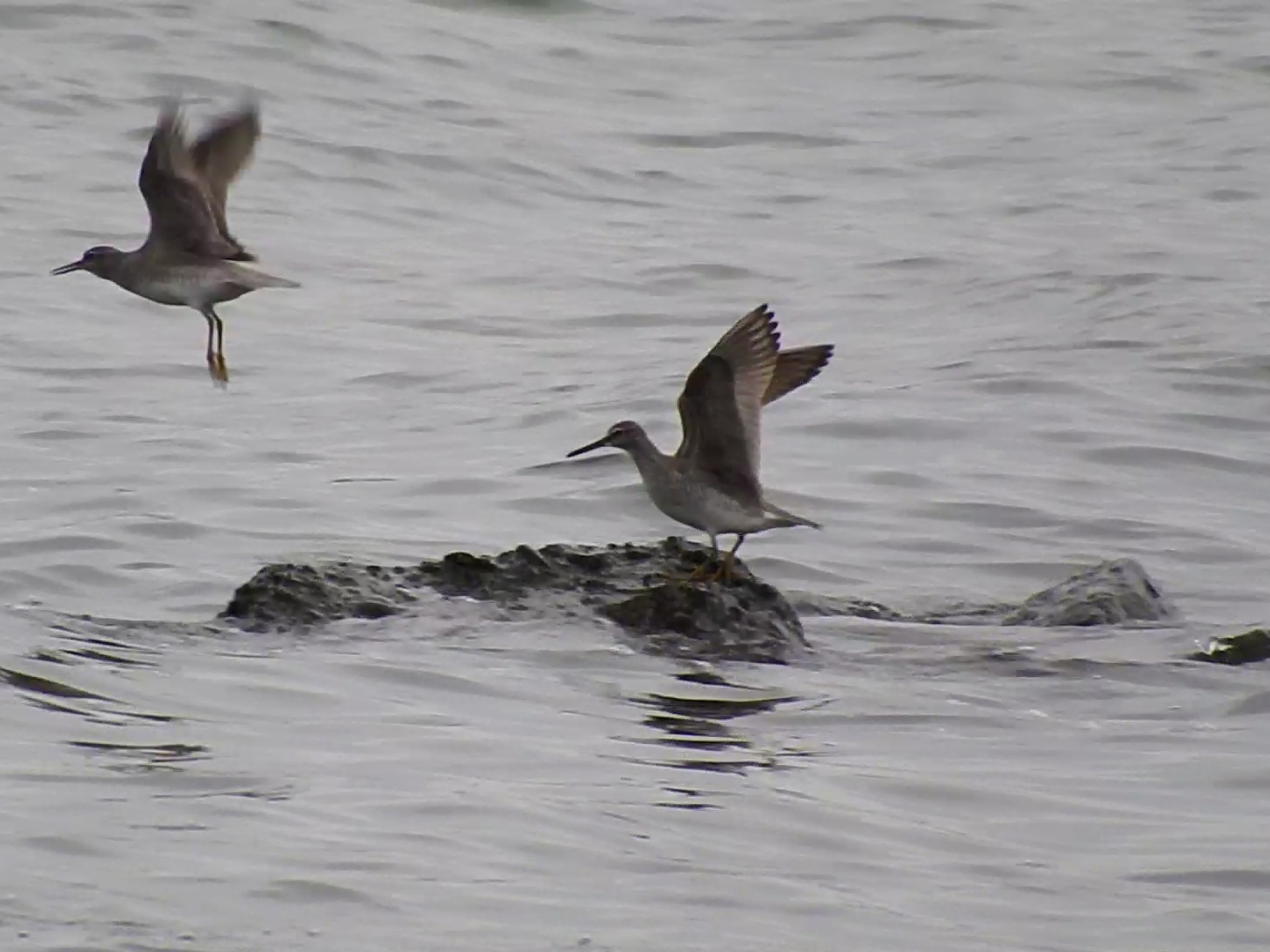 ピーピーと鳴きながらキアシシギた飛んできて、向こうへ行ってしまったと思ったら戻ってきて、わずかに頭を出した磯に下りてくれました。