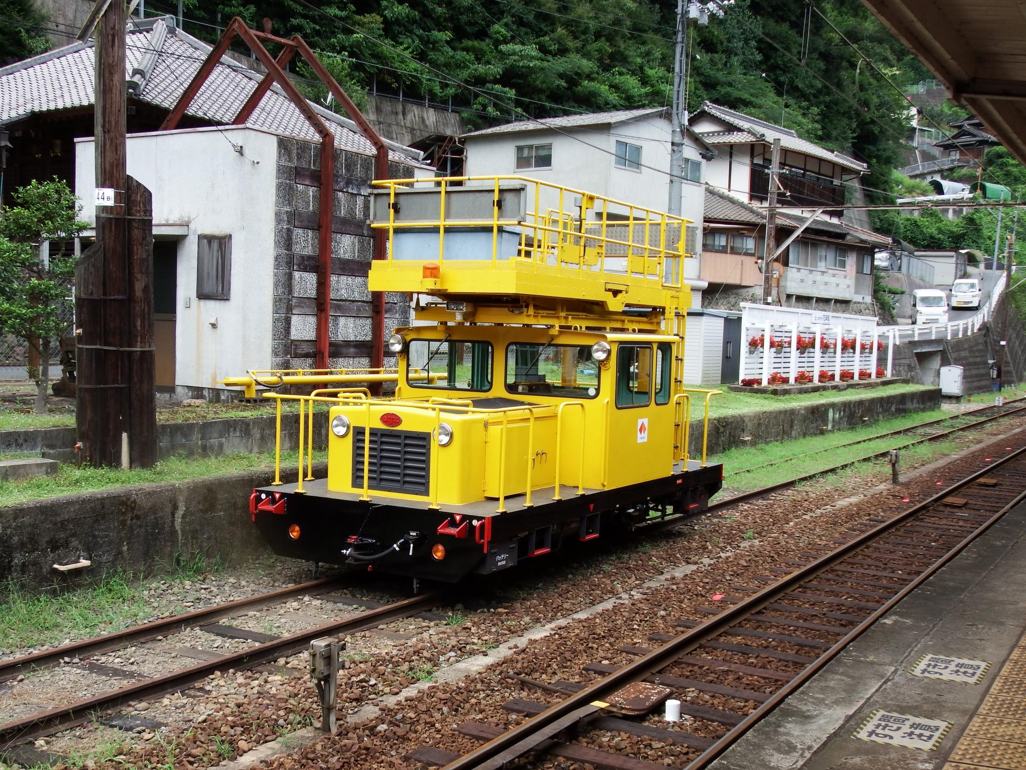 ホームに下りて架線作業車を撮ります。やはりMJK松山重工業製です。