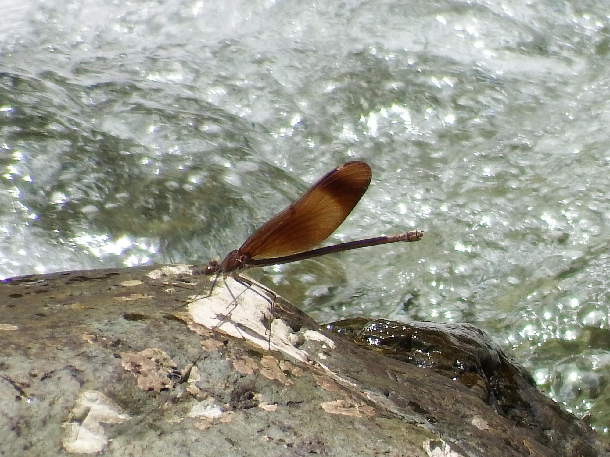 この辺りキセキレイは毎度見かけます。不動谷川の流れを見ていると初見の茶色いトンボ、ミヤマカワトンボ♀です。
