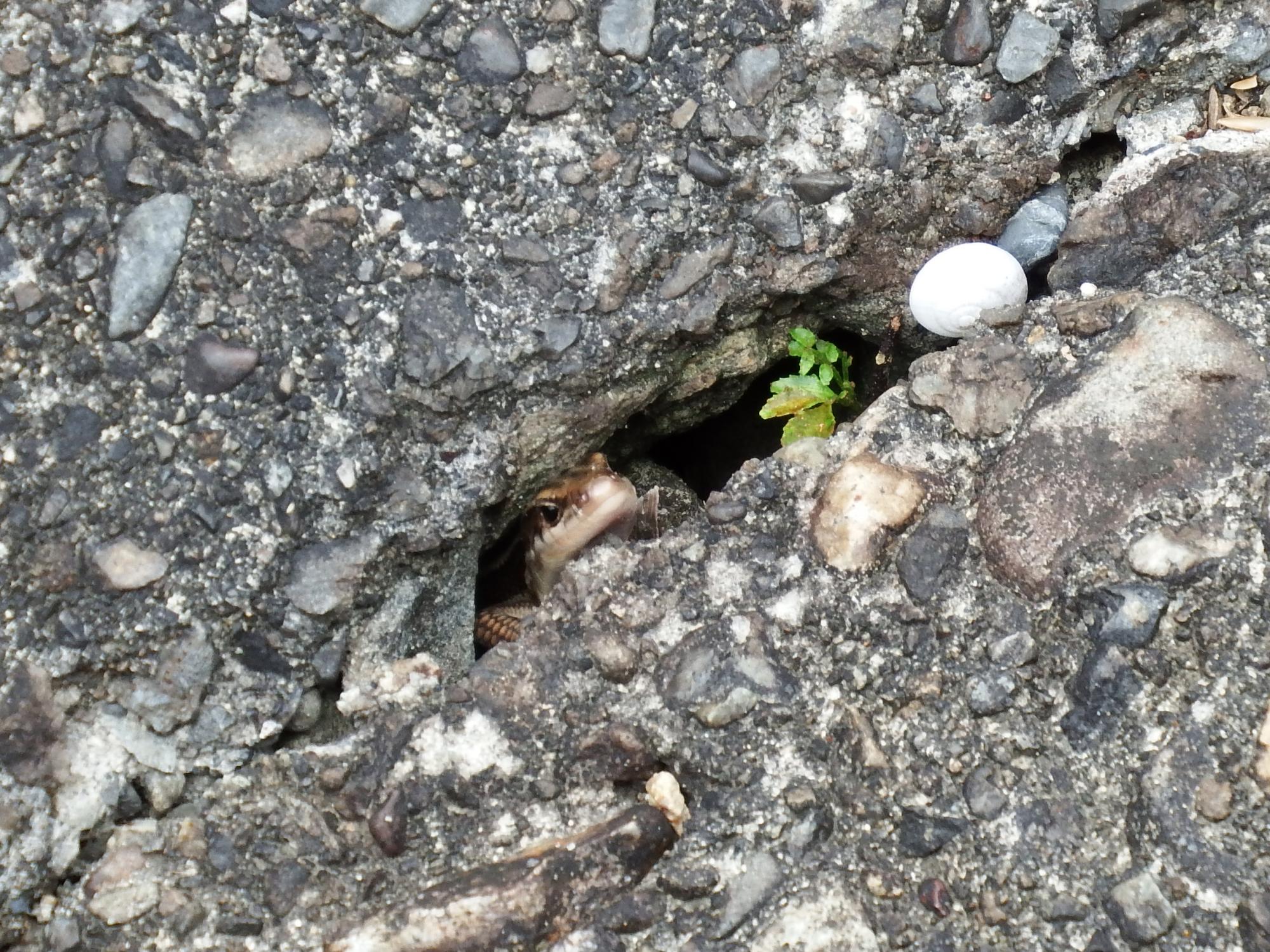 上古沢駅への坂道の割れ目に顔を出しているニホントカゲ。