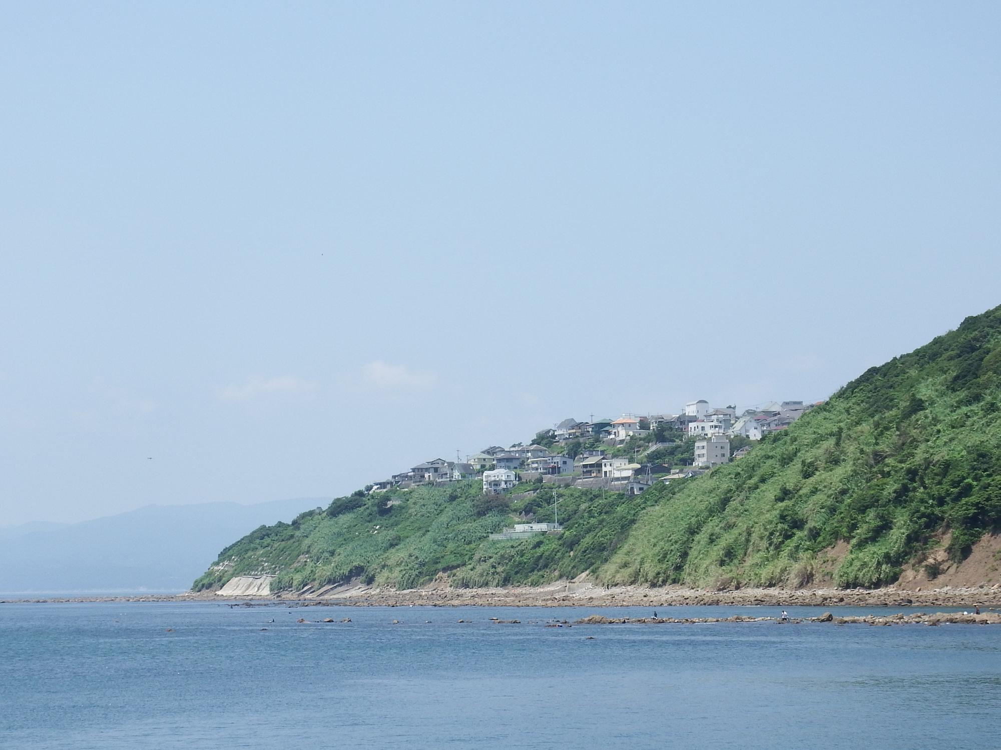 振り返ると紀伊半島の突端、田倉崎に別荘風の家並が見えます。堤防の突端まで来ないと見えない場所です。調べてみたらサニータウンという分譲地、毎日太平洋の絶景を眺められ、価格もリーズナブル。