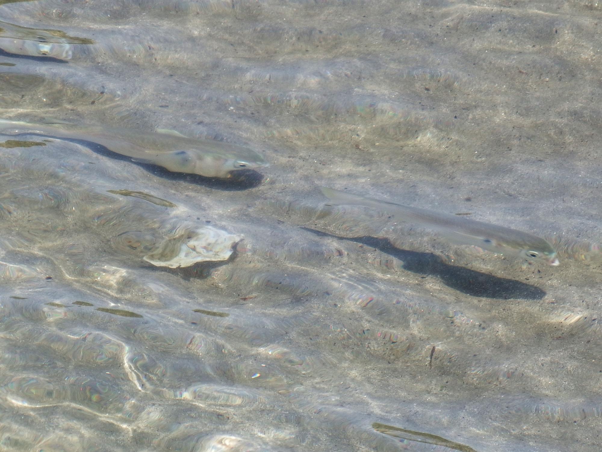 潮位が低く、水も綺麗でいろんな魚が泳いでいるのが見えます。たぶんボラの稚魚かと。