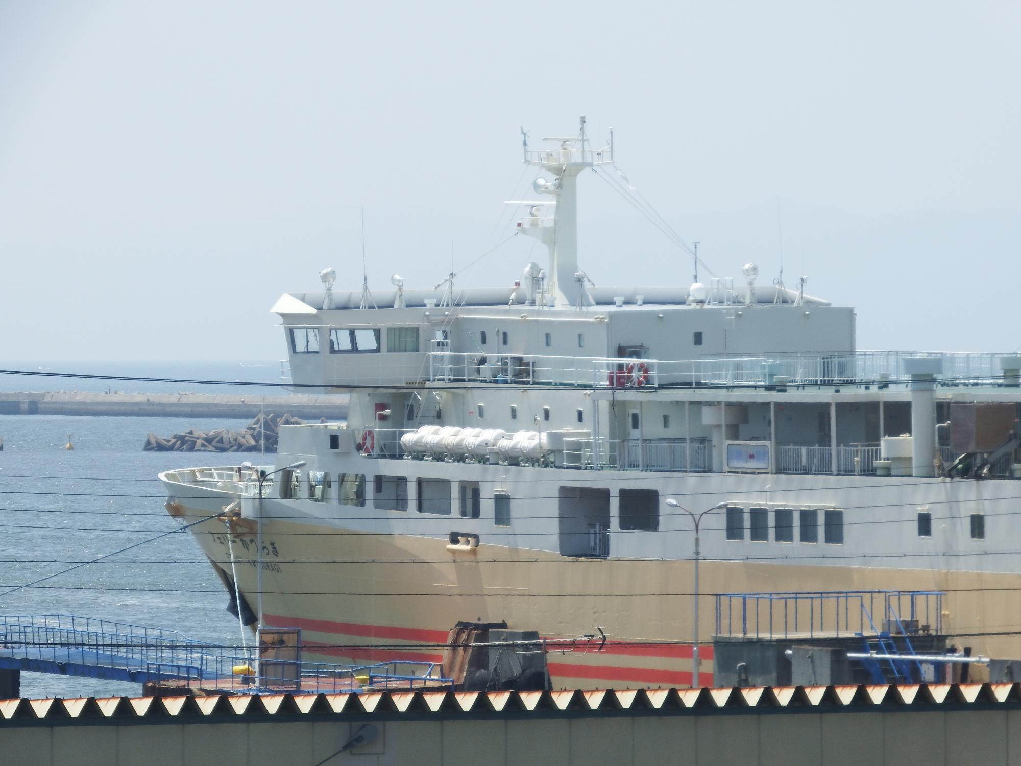 係留されている船はフェリーかつらぎ、2571総トン、徳島港まで2時間15分で結んでいます。大阪から徳島へは淡路島経由の高速バスで2時間半3700円、特急サザンと南海フェリーで3時間半2920円。これならちょっとのんびり船旅の選択肢は十分なりたちそうです。