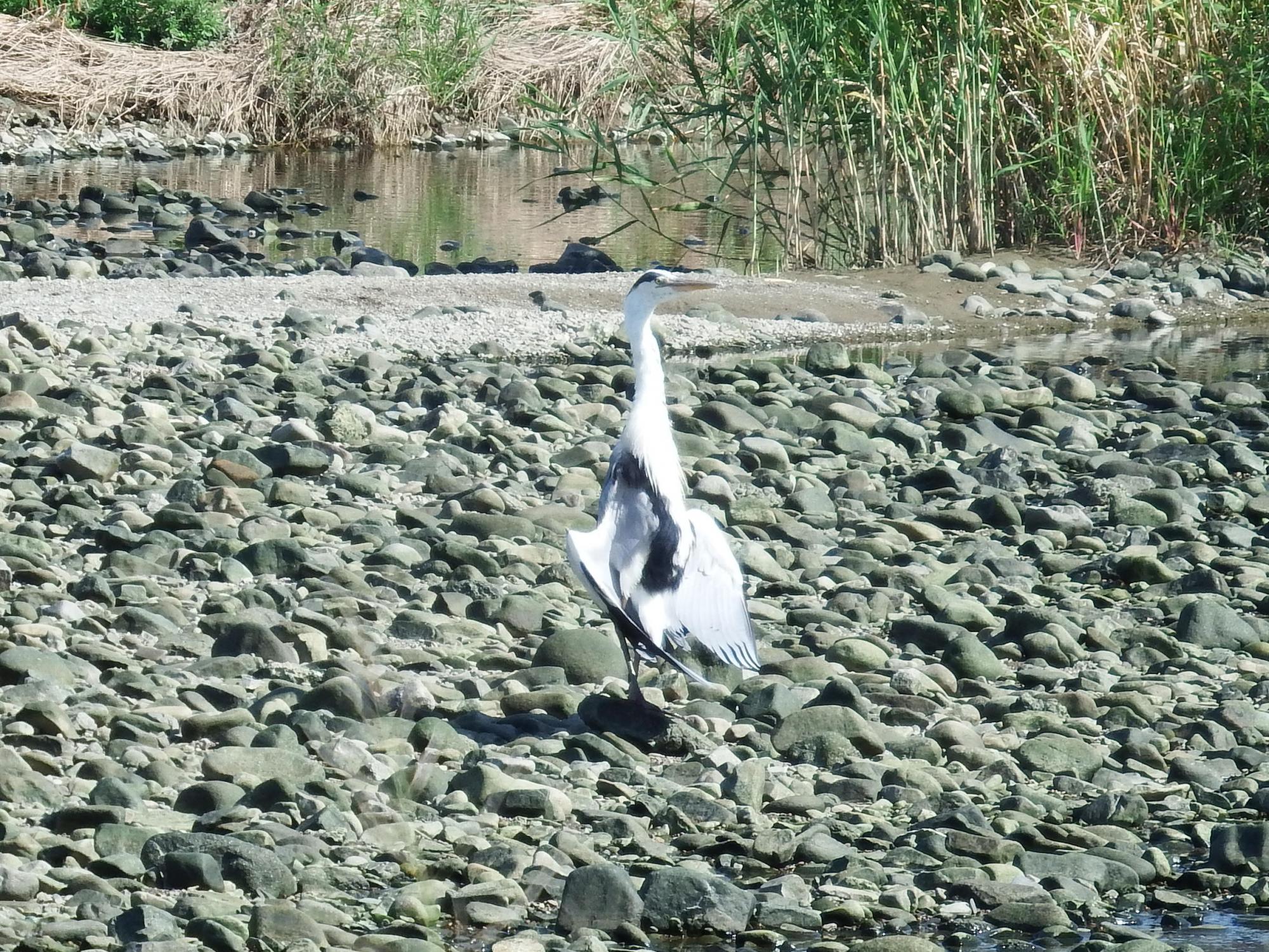 河原でアオサギ先輩が甲羅干し、これだけのクサフグに気づかないはずはなく、フグ毒を分かっているようです。