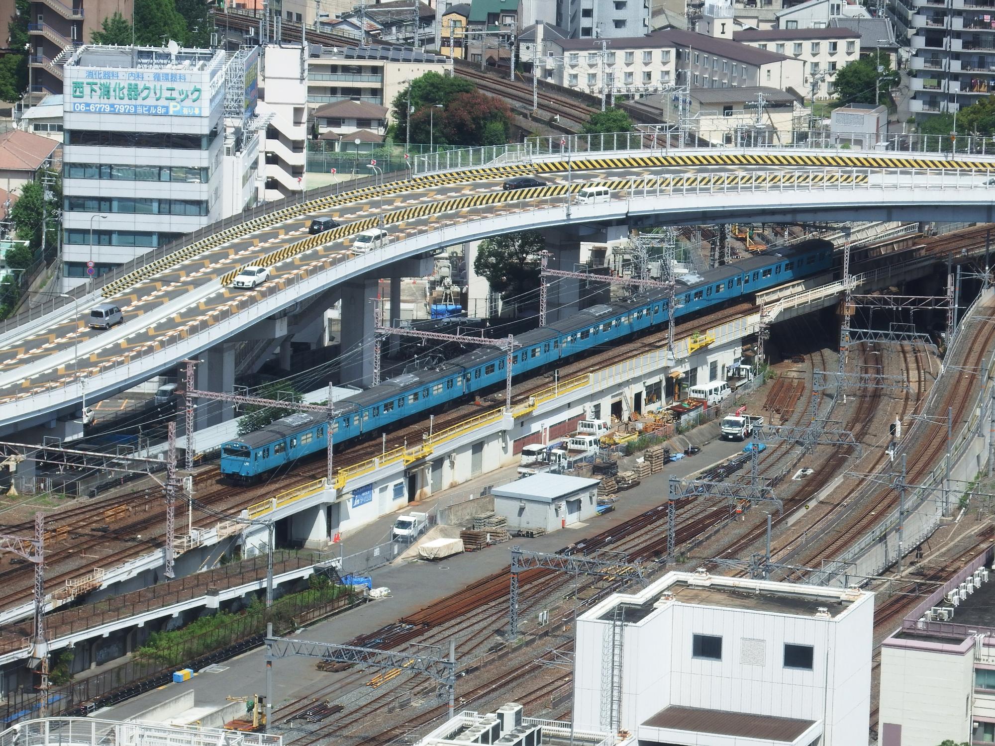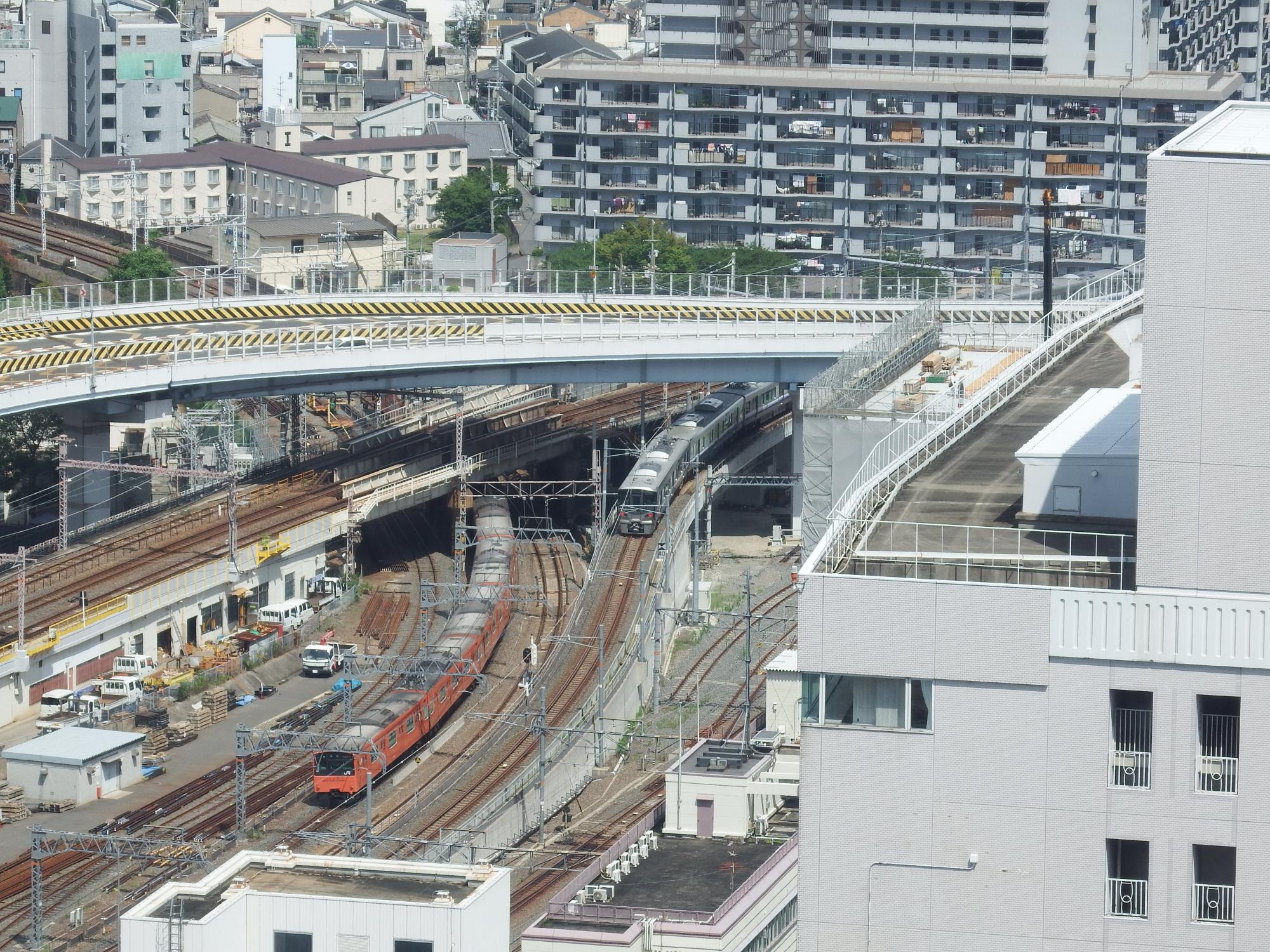 環状線201系と短絡線を上って行く関空/紀州路快速225系。関空/紀州路快速は近鉄の下を潜ります。