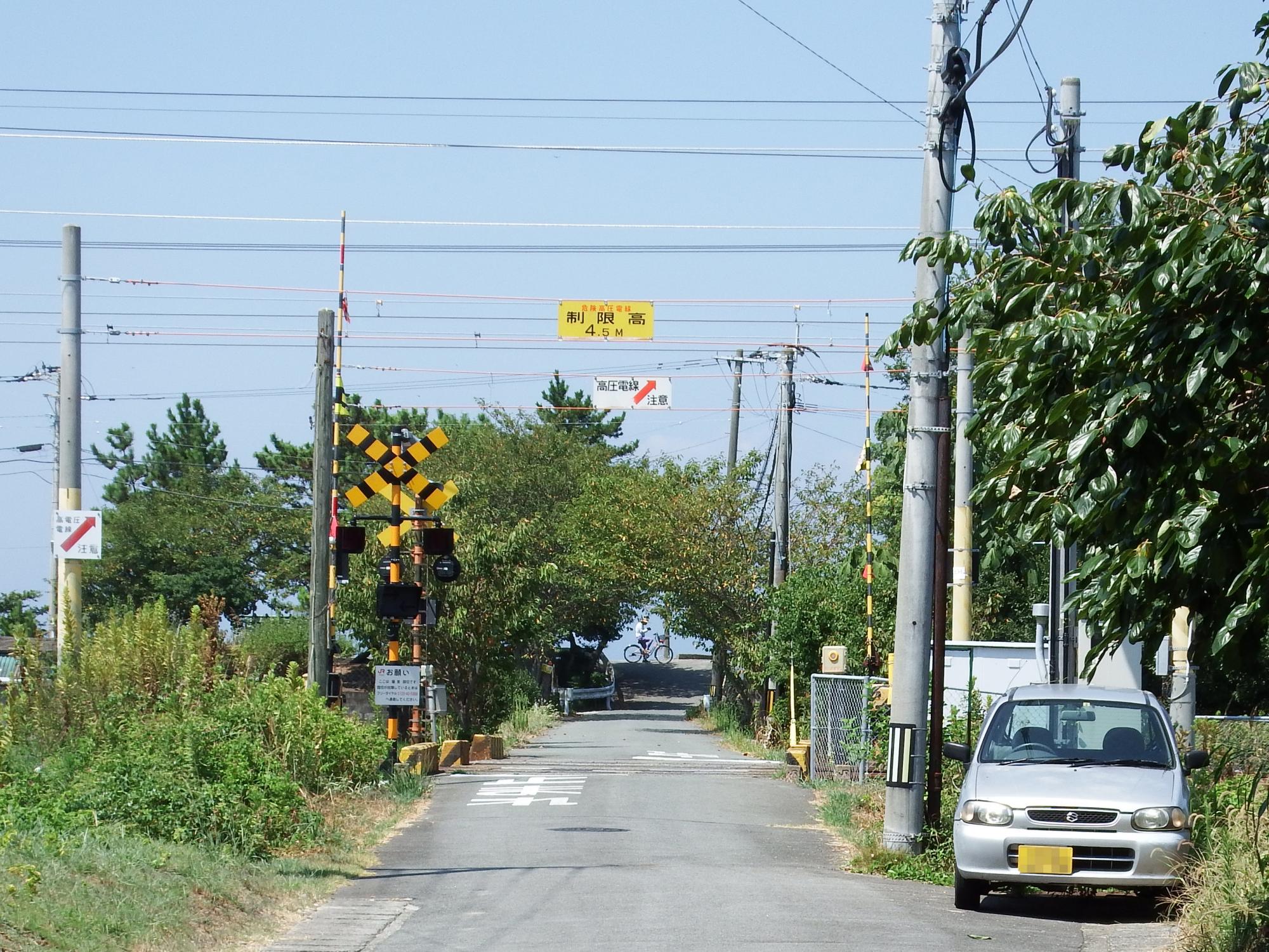 まっすぐ海へ向かう踏切をまだ見慣れない817系が通過。