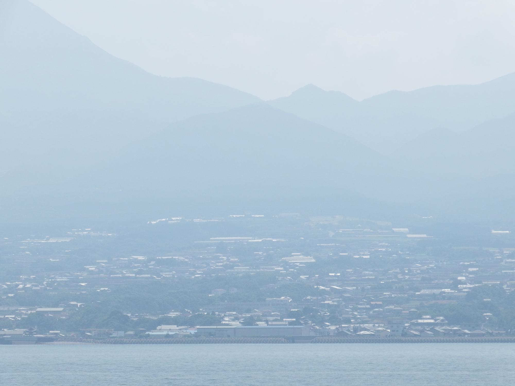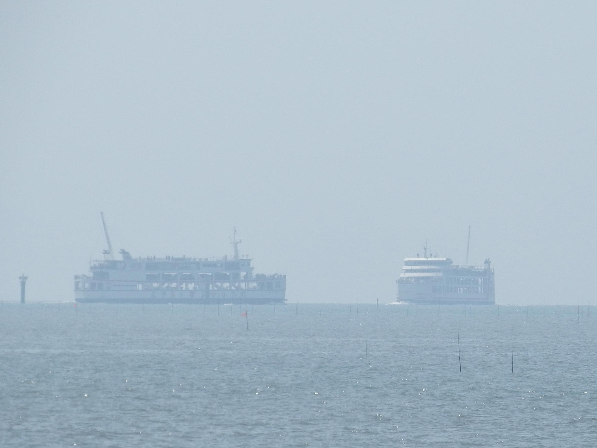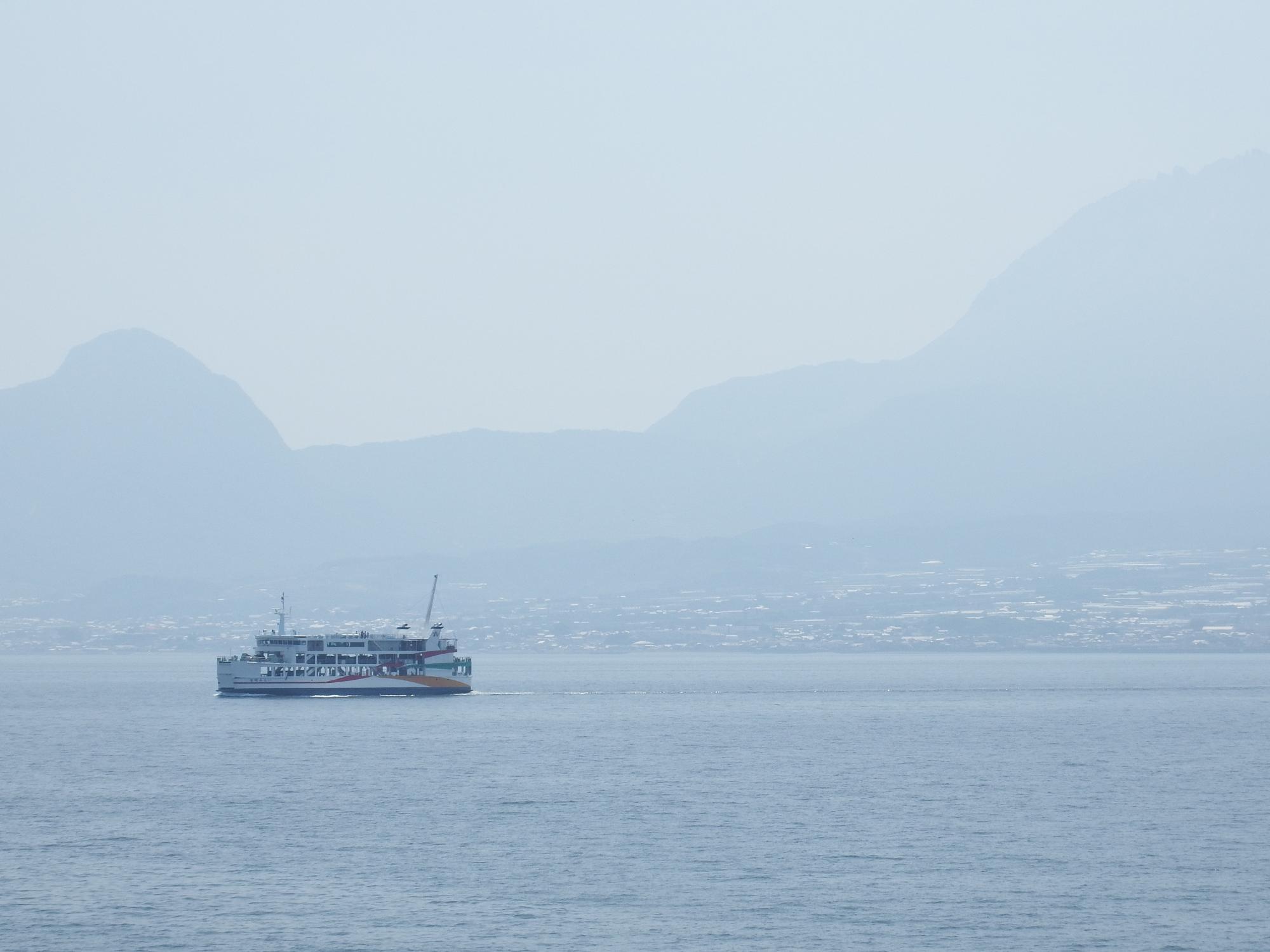 長洲港行のフェリーと行き交います。火山性扇状地に広がる島原の町の後ろ、眉山の頂上が雲仙の稜線の谷と1点で重なって山が透けているような不思議な光景になってます。