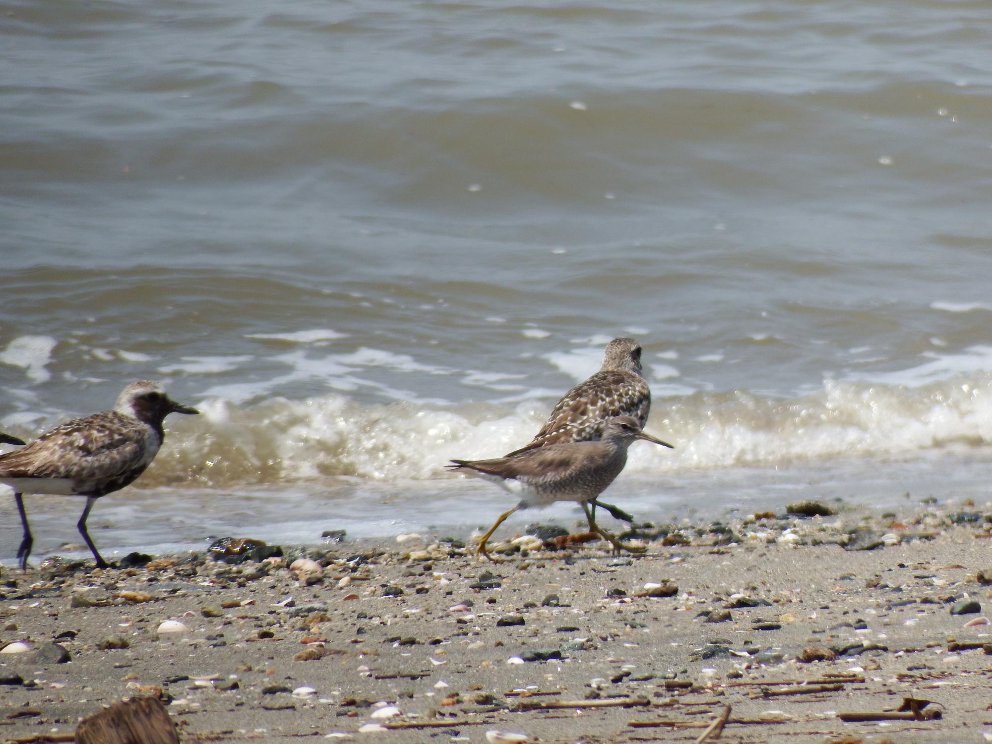 ダイゼンたちの中にキアシシギがまじっていて、忙しく走り回っています。後ろ向きの足があって間違いなくダイゼンです。