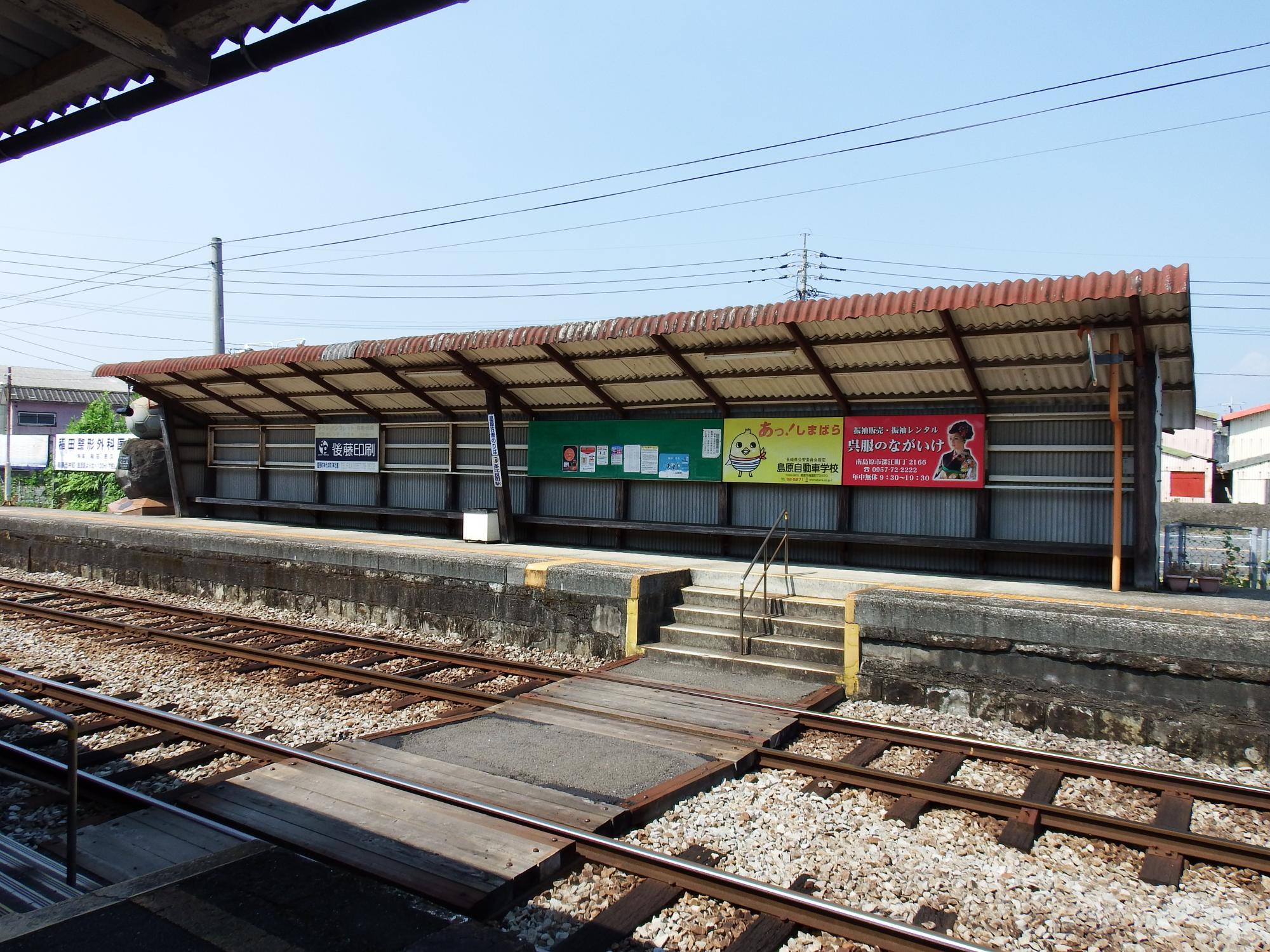 上り諫早行のキハ2500形が到着。ヘッドマークは広告ですが、車体には「おどみゃ島鉄」、島鉄の取締役で古代史研究家の宮崎康平が作った子守歌がおどみゃ島原です。
