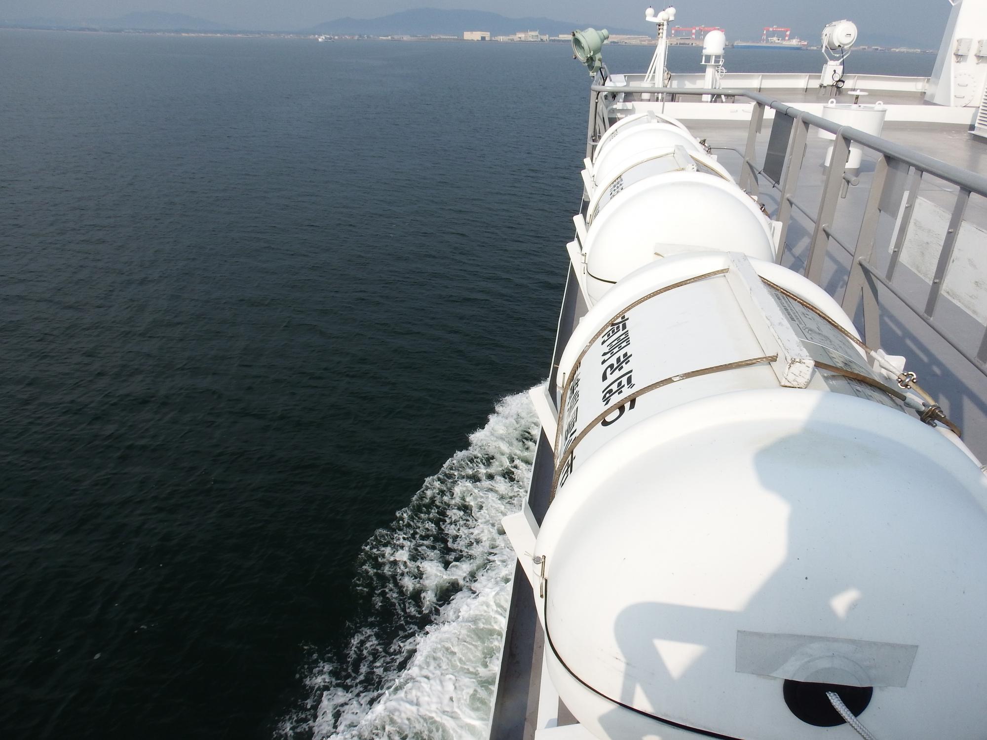 一番上の甲板は屋根もなく直射日光が降り注ぐのですが、海風が心地よくて暑さは気になりません。クーラーの効いた船室に閉じ込められる船よりずっと快適、片道440円は安い。