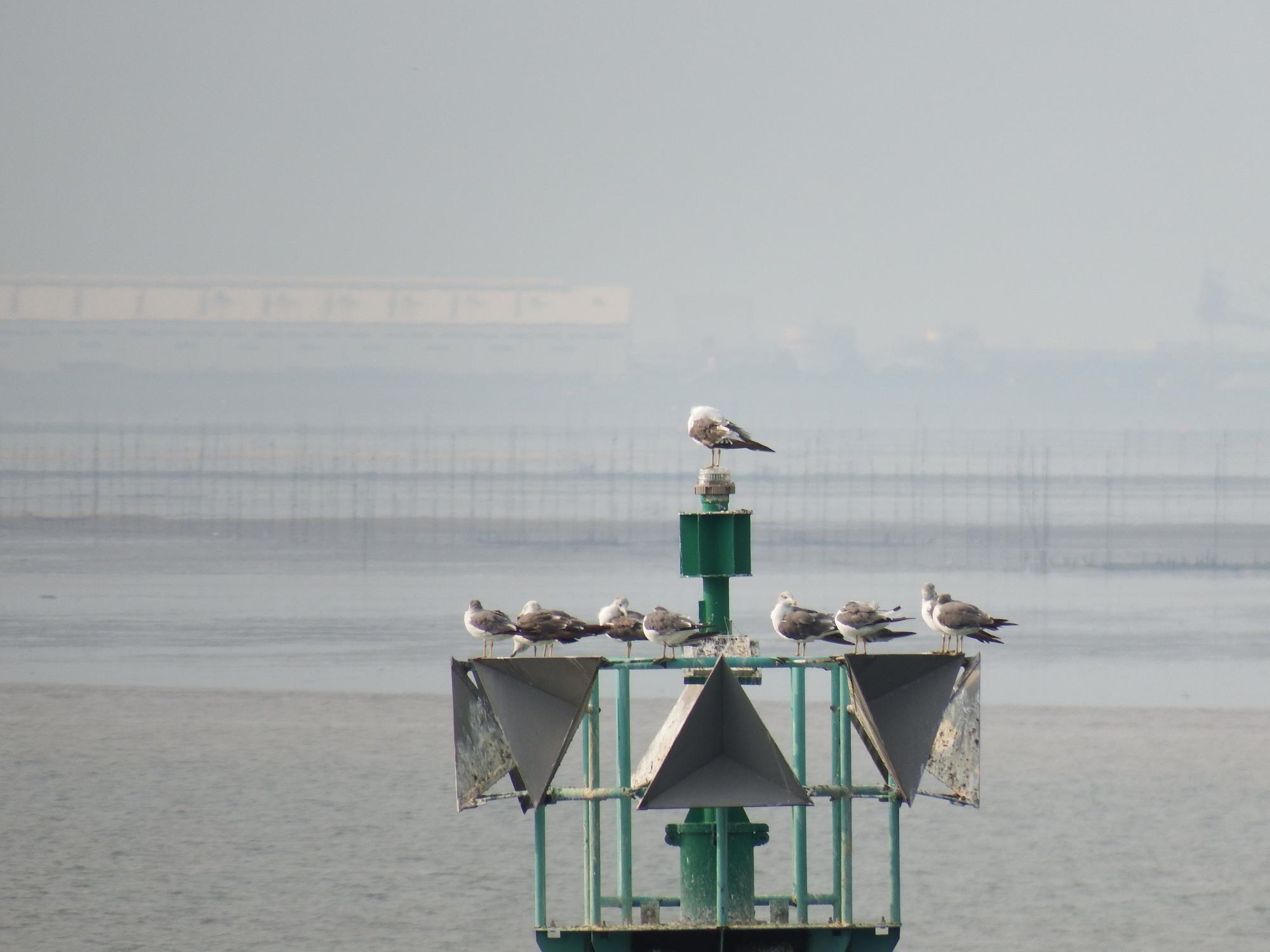 長洲港の入口にならんだ標識灯にウミネコ、船が浅瀬に近寄らないようにするための標識灯と思われます。