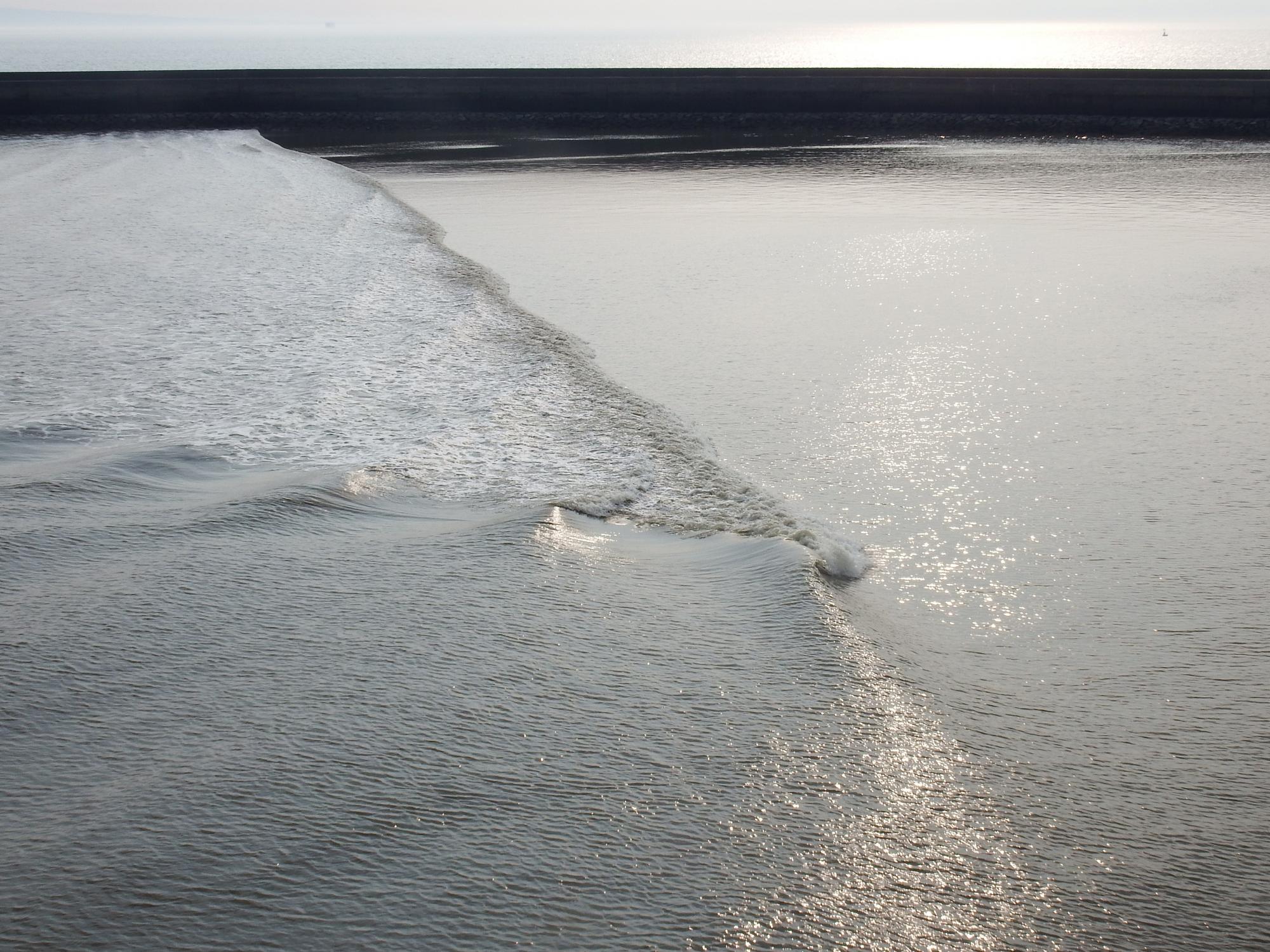 港内で奥行きの長い波が打ち寄せています。毎日頻繁に運行されている有明フェリーですが、ちょっと気を緩めると座礁しかねない高度な操船が必要なはずです。