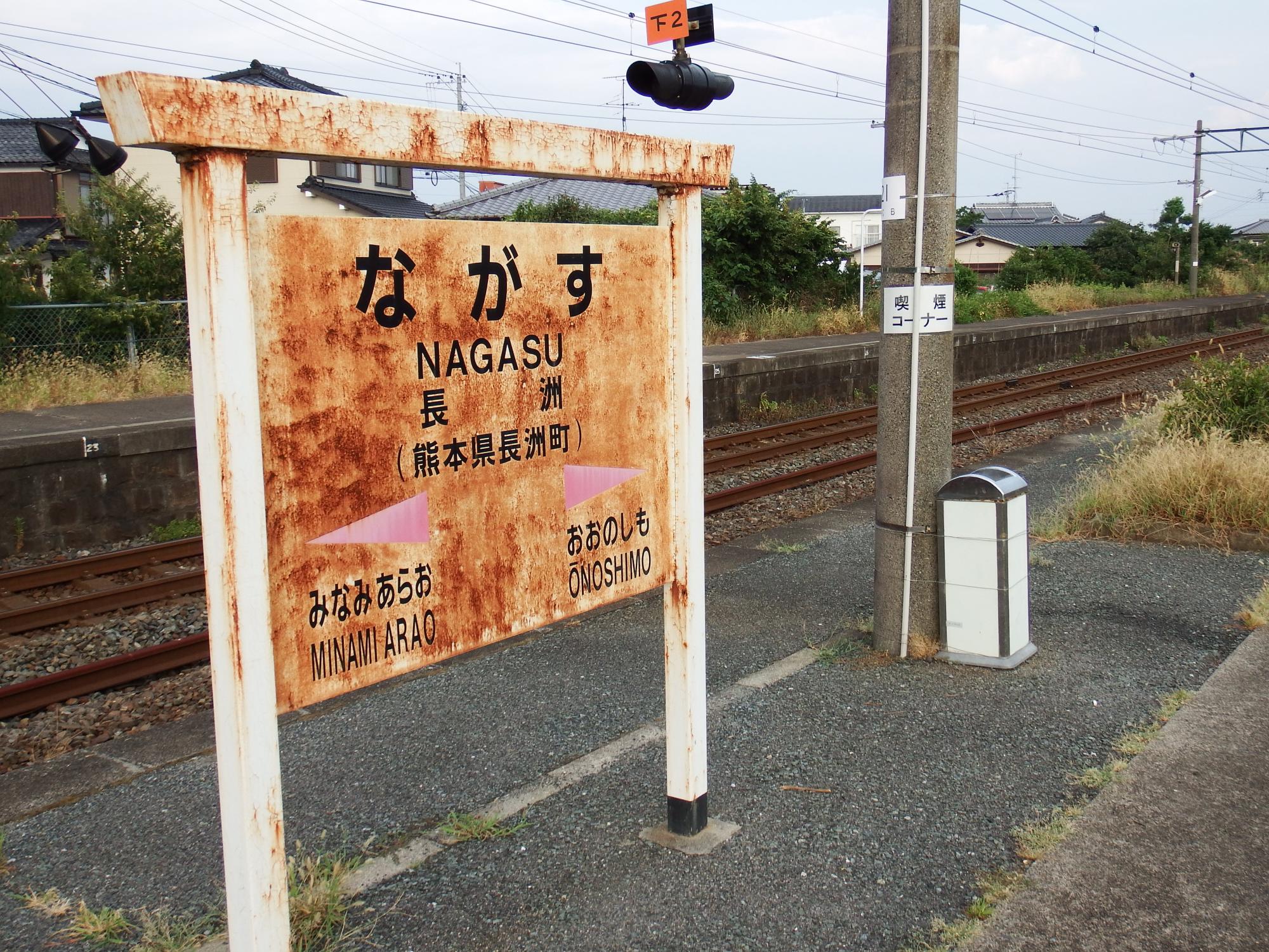 港からタクシーで長洲駅。長いホームの先に錆びた駅名票と喫煙所。九州新幹線ができてローカル列車だけになったかと思いきや、朝夕の通勤ライナーになった特急有明が当駅起点になっています。