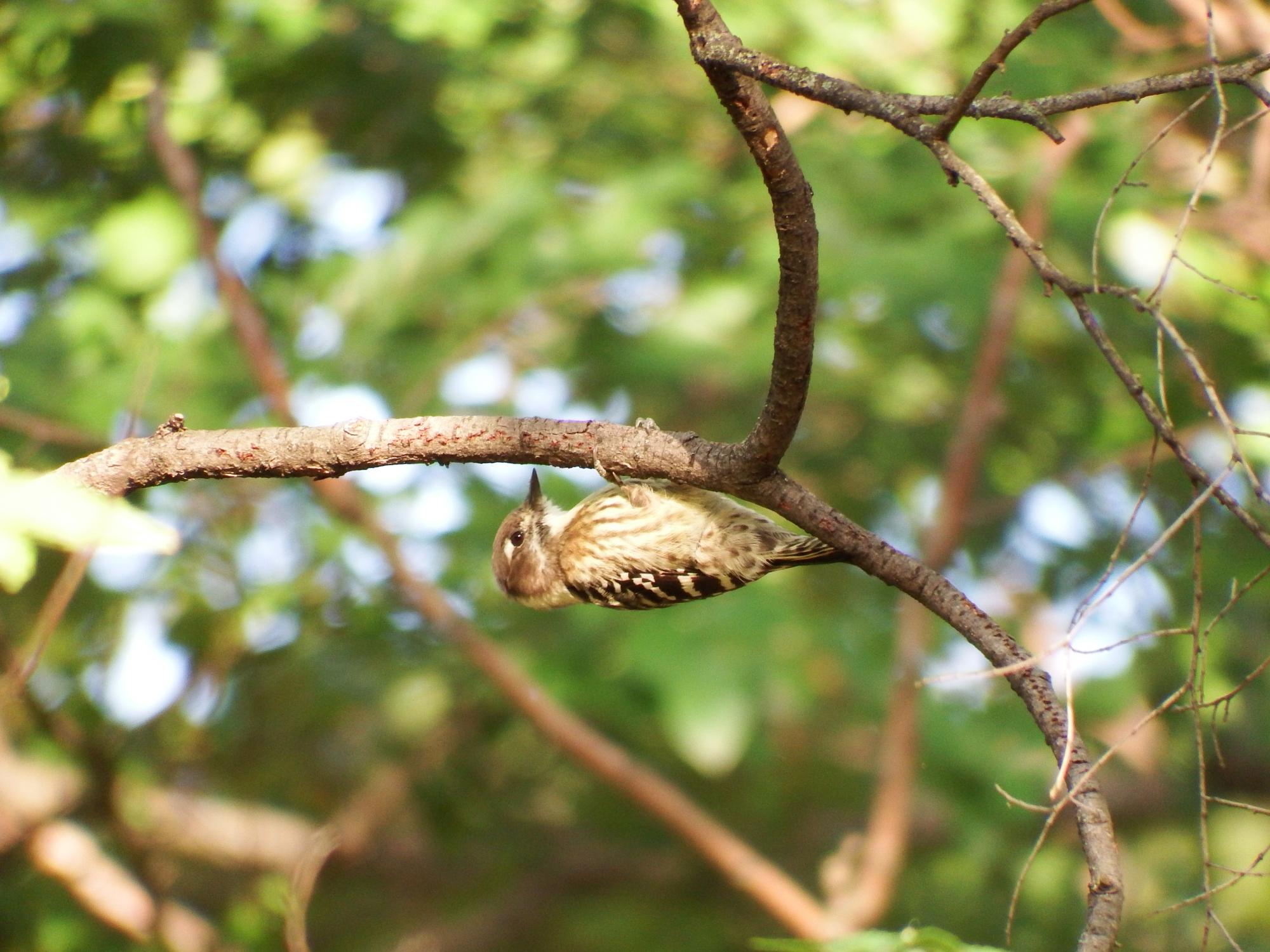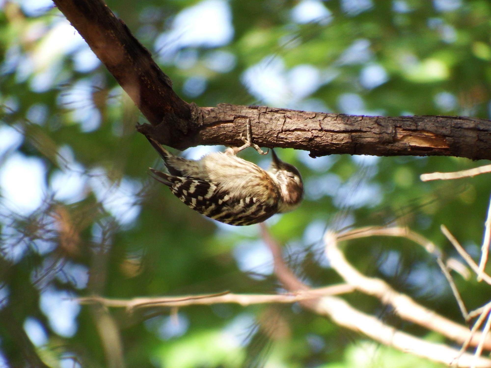 コゲラです。右向きでぶら下がってるシーンもよく見ると瞬膜を閉じています。コゲラの場合は、木くずが飛んでくるのを防いでいるようです。