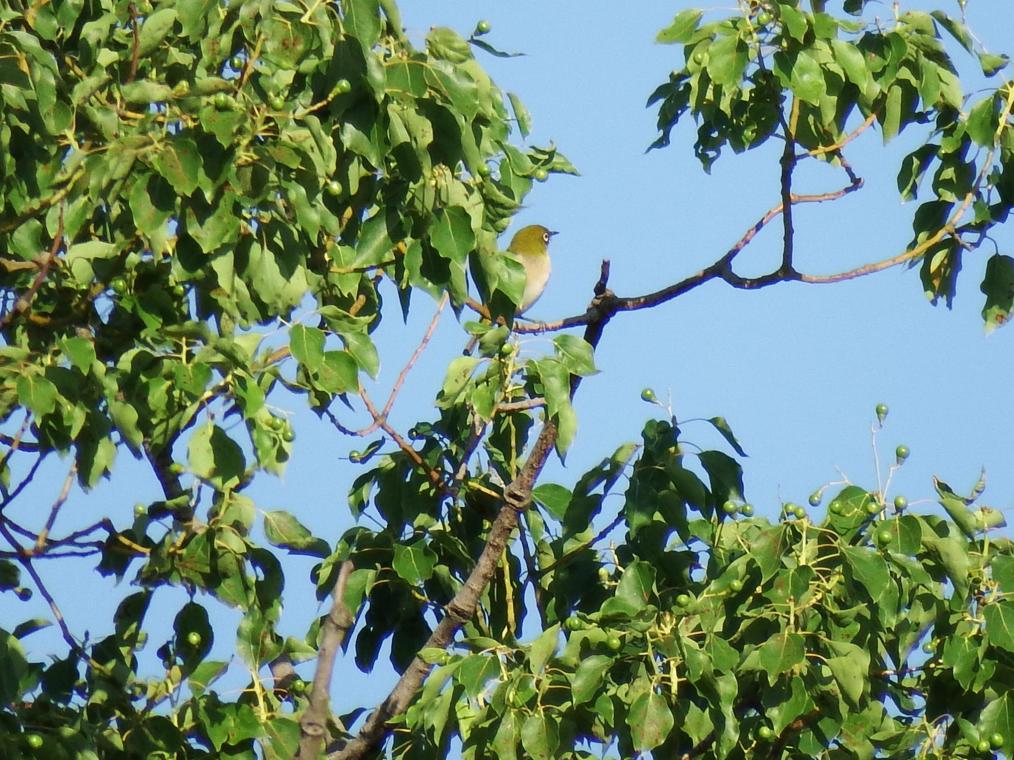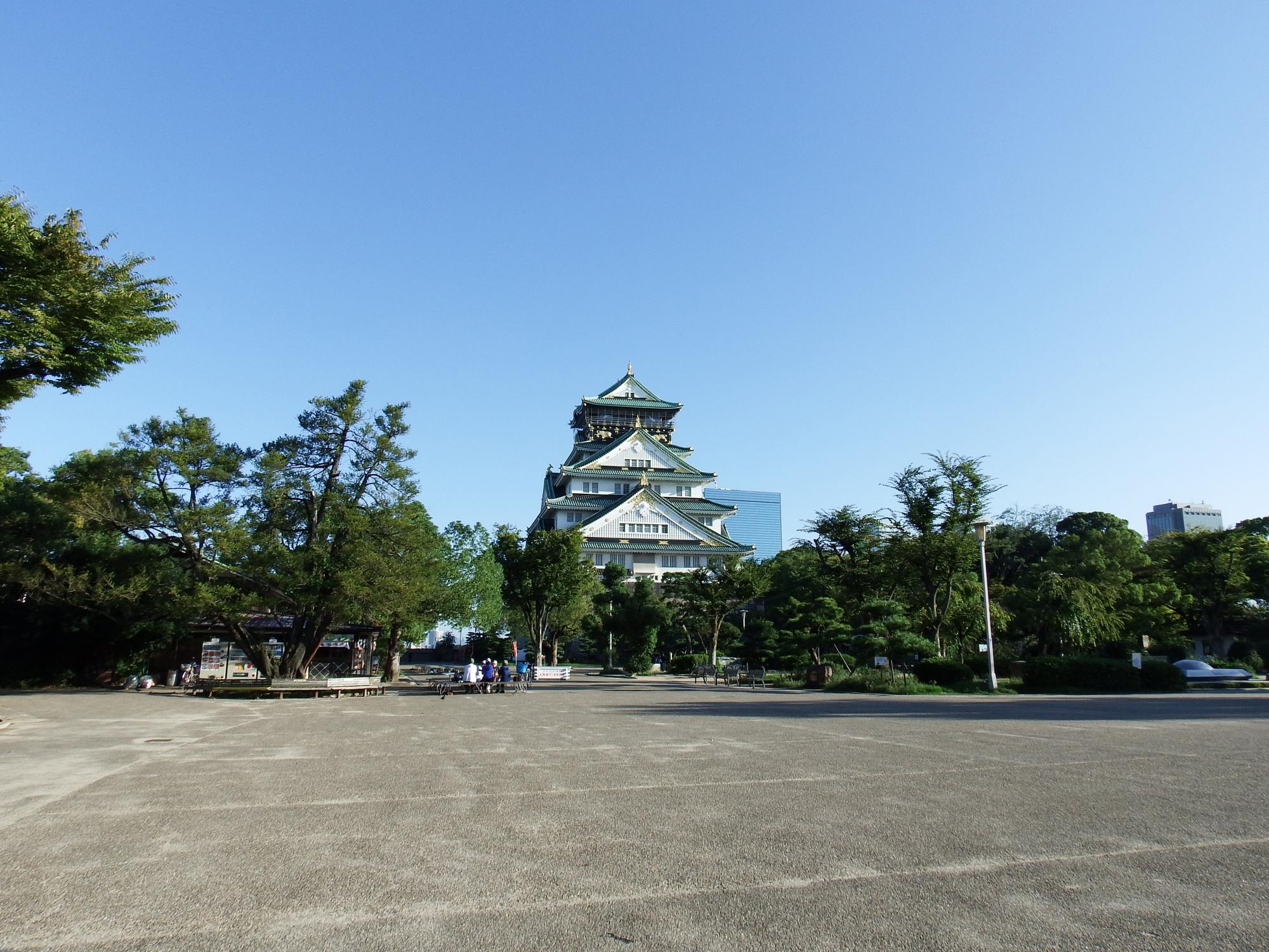 本丸日本庭園の池の前から池の向こう側の木のてっぺんにメジロ、50m先ですがくっきり。ラジオ体操の人たちが帰って、観光客が来るまでがらんとした本丸広場、雲一つない気持ちいい快晴。