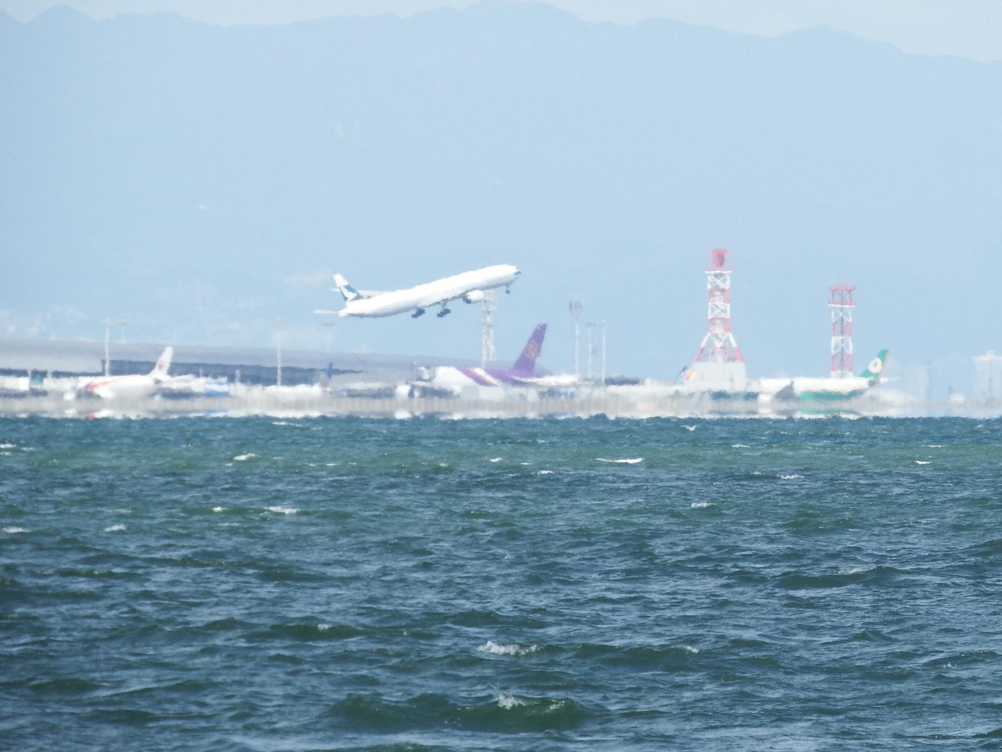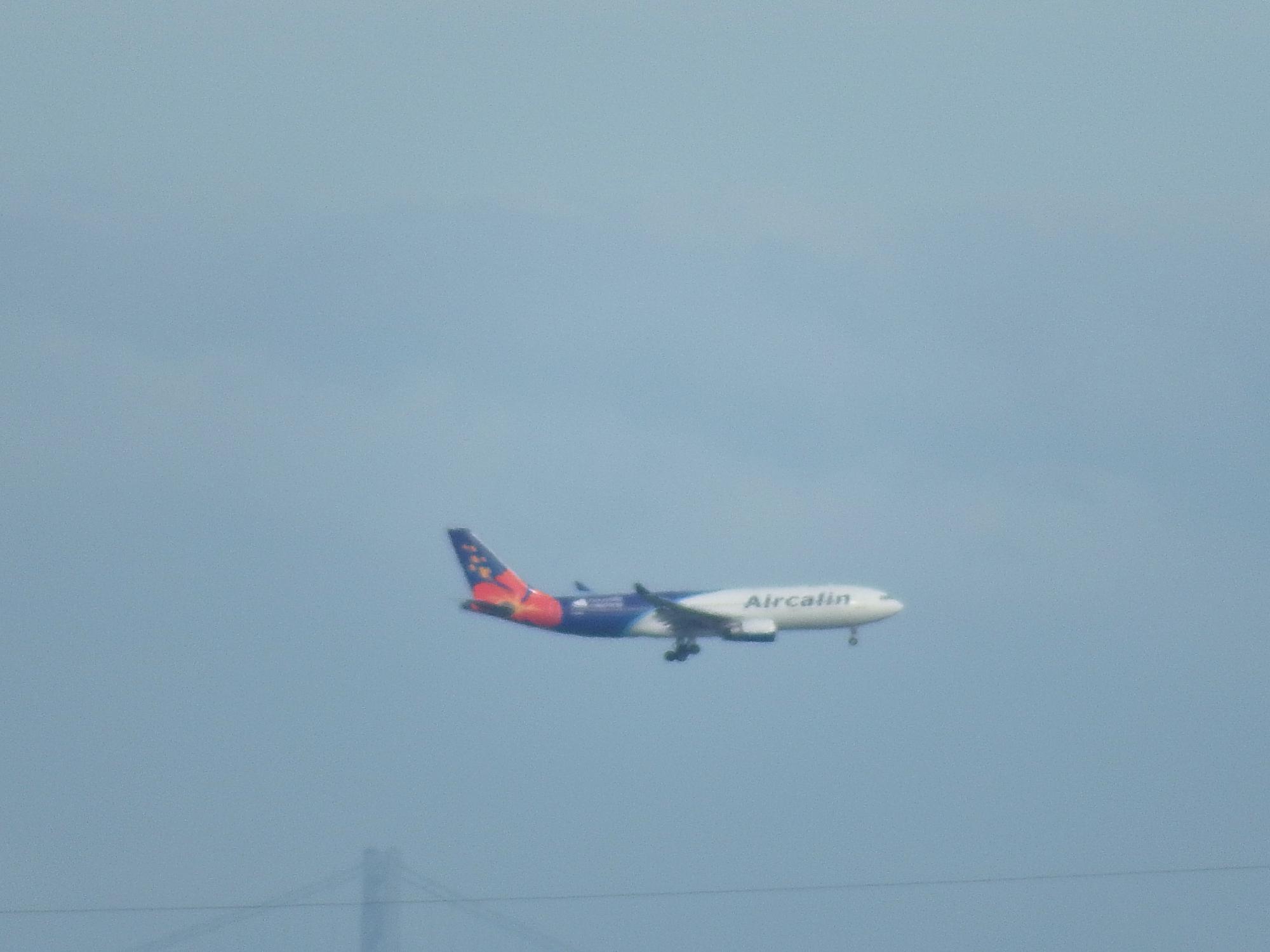 高台にあるので関空に着陸する飛行機がよく見えます。ニューカレドニアの航空会社エアカラン機、後ろにうっすらと明石海峡大橋も写ってます。